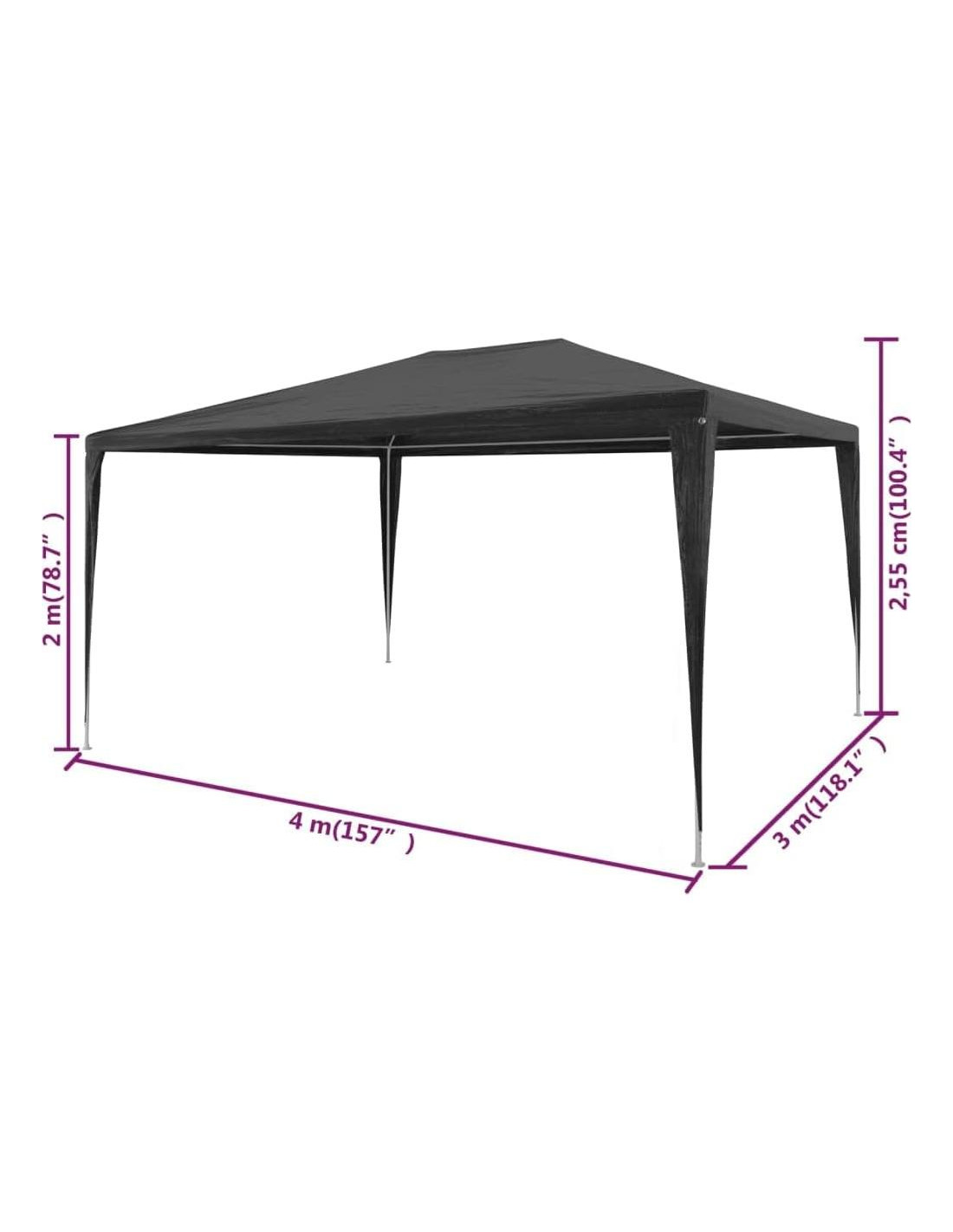 Nuestra carpa de fiesta proporciona un lugar maravilloso para entretener a su familia y amigos en todo tipo de fiestas y reuniones al aire libre. La carpa de fiesta está hecha de material de polietileno resistente a UV y agua, por lo que es muy práctica para uso al aire libre. El marco está fabricado con acero resistente a la corrosión, lo que hace que la carpa al aire libre sea estable y duradera. El gazebo de jardín es fácil de ensamblar. NOTA: Para asegurarse de que su mobiliario de exterior se mantenga hermoso, recomendamos protegerlo con una funda. Este producto NO debe usarse nunca bajo mal tiempo, como viento fuerte, lluvia intensa, nieve, tormenta, etc. Color: Antracita Material: Techo de PE y marco de acero Dimensiones: 9.8' x 13.1' x 8.4' (L x A x A) Altura del alero desde el suelo: 6.6' (2.01m) Resistente a UV y agua Materiales de montaje incluidos
