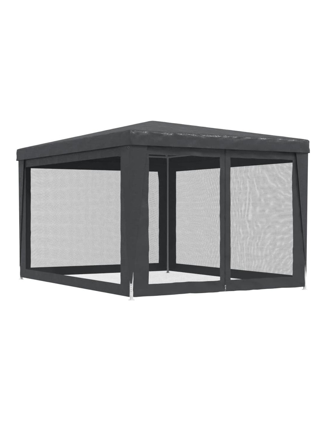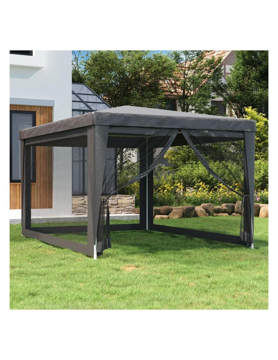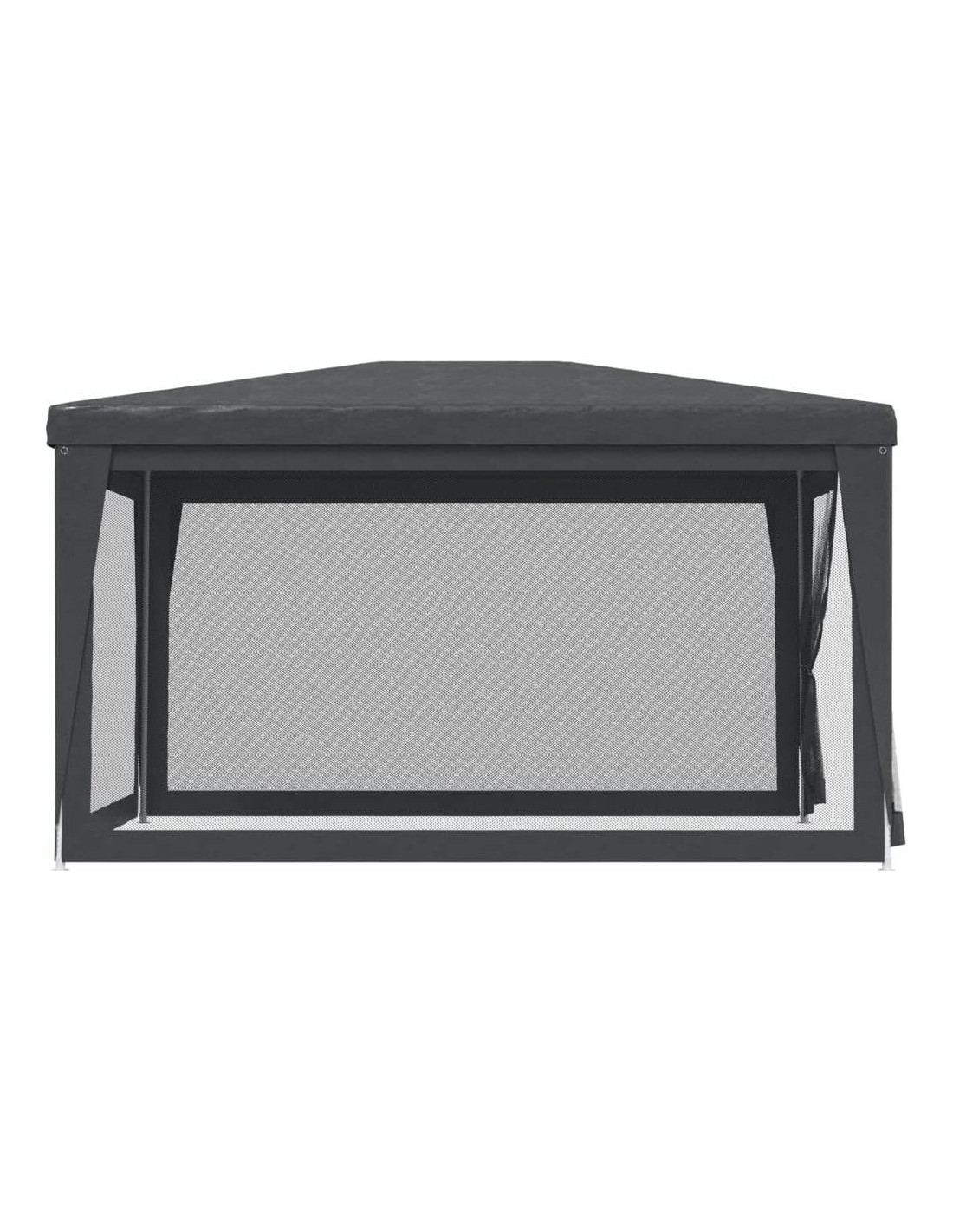 Hogar y Jardín / Césped y Jardín / Vida al Aire Libre / Estructuras al Aire Libre / Toldos y Gazebos Esta increíble carpa de fiesta, con un marco de hierro resistente, un techo resistente al agua y cuatro paredes laterales de malla, es un refugio ideal del sol. Material premium: Este gazebo está hecho de polietileno de alta densidad (HDPE) que te protege de la luz solar directa y permite suficiente viento. El HDPE está especialmente tratado, por lo que también es resistente al agua. Marco de hierro: El marco de hierro de este pabellón asegura robustez y estabilidad. Diseño práctico: La marquesina tiene cuatro paredes laterales de malla, que te protegen de los molestos insectos. Y una de las paredes laterales tiene una cremallera para entrada y fácil acceso. Amplias aplicaciones: Esta carpa para eventos es una opción ideal para una amplia gama de eventos al aire libre, como espectáculos, bodas, fiestas, barbacoas, festivales, etc. Nota: Este producto NO debe usarse nunca bajo mal tiempo, como viento fuerte, lluvia intensa, nieve, tormenta, etc. Cada producto viene con un manual de ensamblaje en la caja para un fácil montaje. Color: Antracita Material: HDPE (polietileno de alta densidad) con recubrimiento, hierro con recubrimiento en polvo Dimensiones: 297.8 cm x 396.2 cm x 246.4 cm (L x A x A) Altura del alero desde el suelo: 2.0 m Resistente a los rayos UV Resistente al agua 4 paredes laterales de malla, una pared tiene una cremallera para entrada La entrega contiene: 1 x Carpa 1 x Cuerda 8 x Estaca