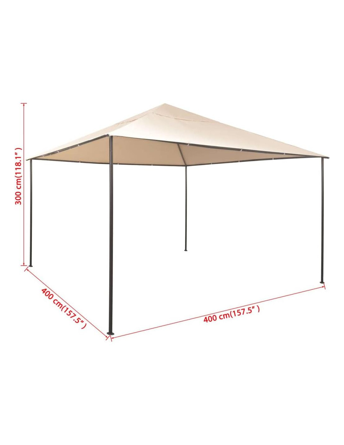Jardín y Césped / Vida al Aire Libre / Estructuras al Aire Libre / Toldos y Gazebos Este gran gazebo será un gran refugio para reuniones familiares, barbacoas, picnics por la tarde, camping, fiestas de cumpleaños, etc. Hecho de tela oxford de alta calidad con recubrimiento PA, este gazebo es repelente al agua y a la suciedad y resistente a los rayos UV. La fuerte estructura de acero hace que el gazebo sea robusto y muy duradero. Este gazebo será una elección perfecta para tus actividades al aire libre. El ensamblaje es realmente fácil. NOTA: Este producto NO debe usarse nunca bajo mal tiempo, como viento fuerte, lluvia intensa, nieve, tormenta, etc. Color: Beige Material: Estructura de acero + techo de tela oxford resistente al agua Dimensiones generales: 400 cm x 400 cm x 300 cm (L x A x A) Ensamblaje fácil Tela: Poliéster: 100%