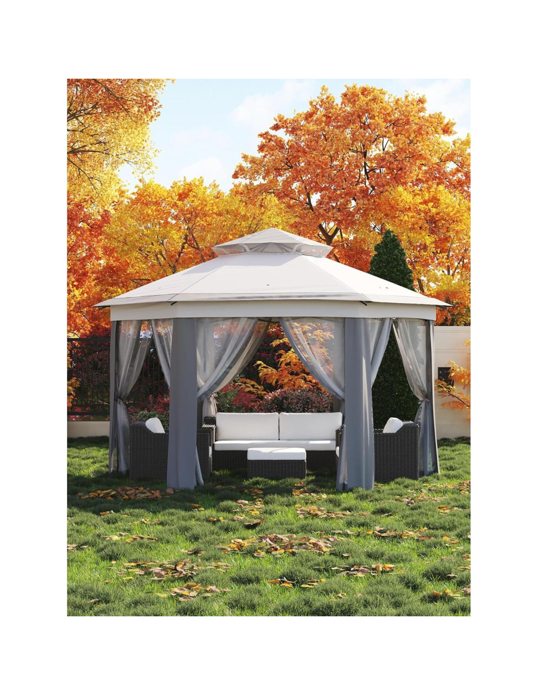 - DIMENSIONES: Tamaño total: 4.06 m x 4.06 m x 2.83 m; altura del alero: 2.01 m; longitud de lado hexagonal: 2.01 m. No dejes tu refugio desatendido; desmóntalo antes de que llegue una tormenta fuerte. Asegúrate de usar las estacas incluidas y las cuerdas de sujeción proporcionadas durante su uso.
