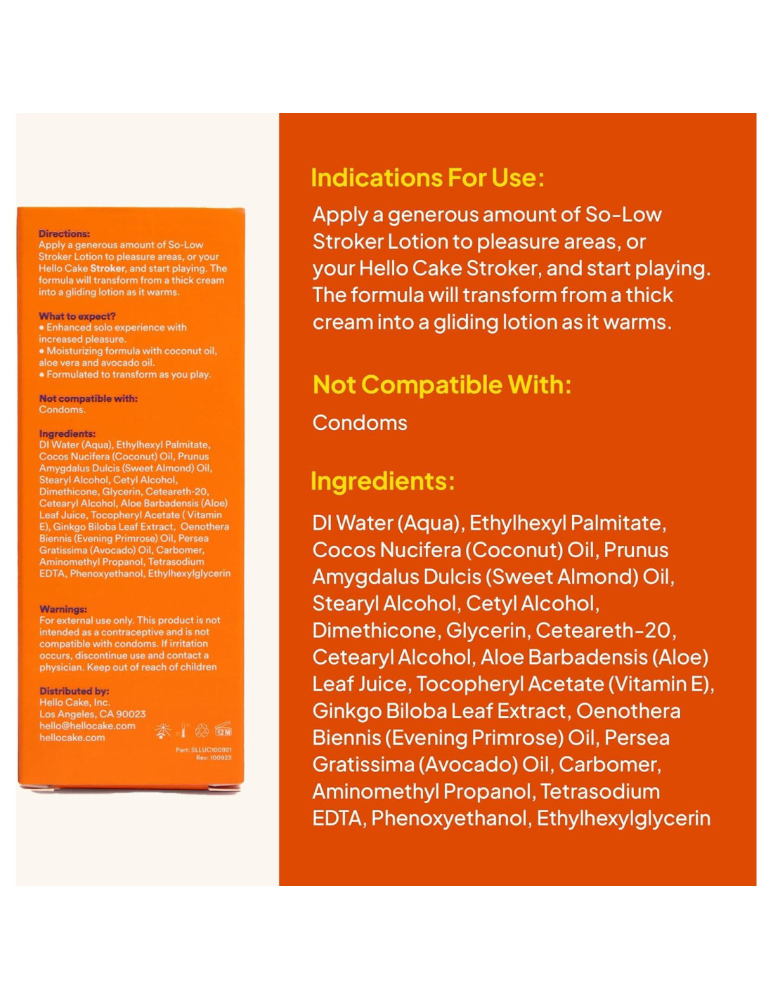 - DISFRUTA TU TIEMPO A SOLAS: Mantén una botella de la loción So-Low de Cake en tu mesita de noche para un fácil acceso. Combínala con tu Stroker de Cake favorito para más diversión. No se recomienda su uso como lubricante interno.