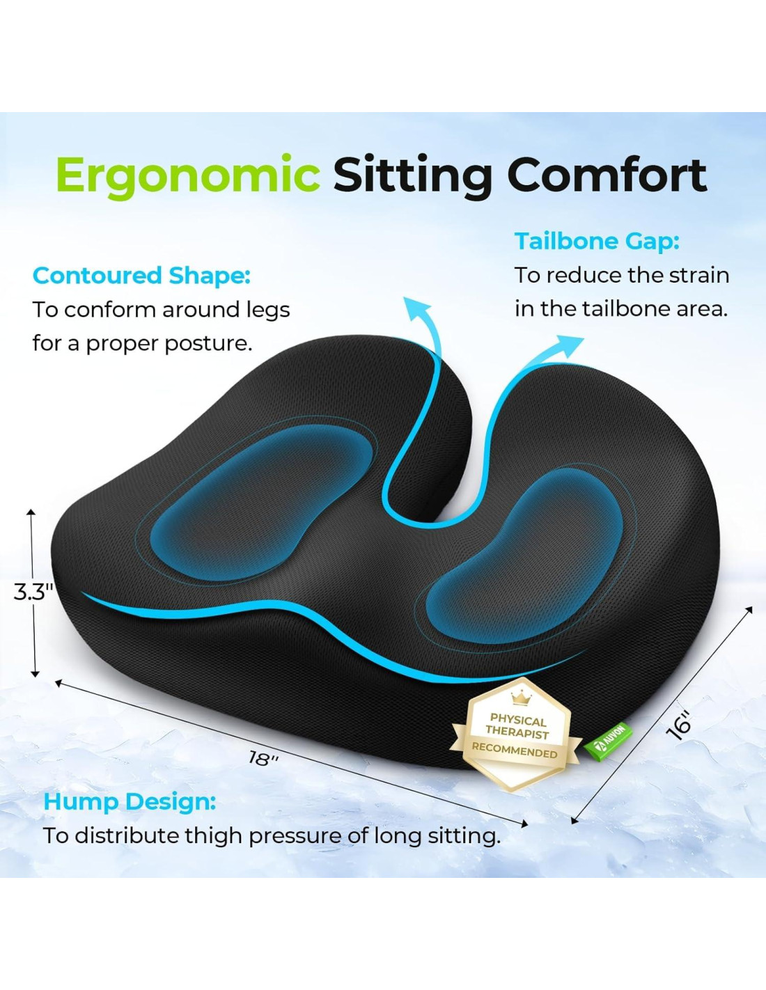 - Alivio del dolor por largas sesiones de sentado: Este cojín de alivio de presión es una gran opción para la mayoría de las personas que se sientan en una silla durante largos períodos. El cojín para silla de oficina puede ayudar a aliviar la fatiga corporal, la incomodidad en la parte baja de la espalda, el dolor de cola, la ciática y otros problemas espinales causados por estar sentado (NO para usar durante brotes severos de hemorroides).