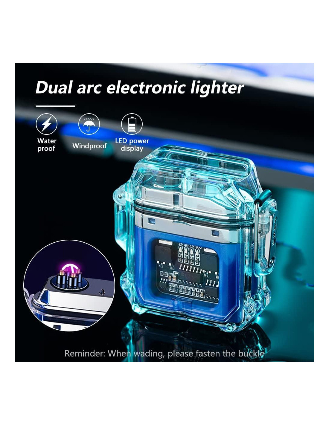 - "Cuerpo a prueba de agua y transparente" Este encendedor eléctrico adopta un diseño de triple sellado, que es sellado y a prueba de agua. Todo el encendedor puede entrar en el agua, por lo que no tienes que preocuparte por encender en días de lluvia. Nota: Cuando uses este encendedor a prueba de agua, el broche debe estar bien ajustado.