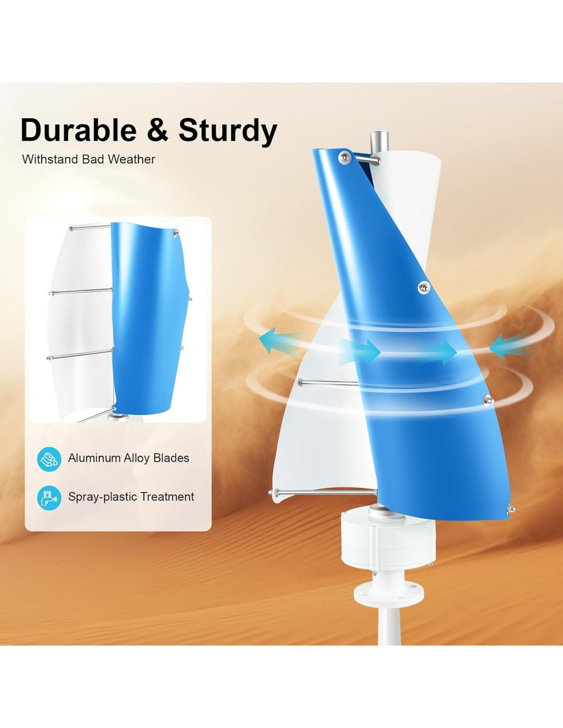 - Robusto y Duradero: Adopta un generador de imán permanente con un núcleo de hierro emparejado con dos aspas de aleación de aluminio, y la superficie está rociada con plástico, lo que puede soportar mal tiempo y asegura la operación larga y estable del producto.