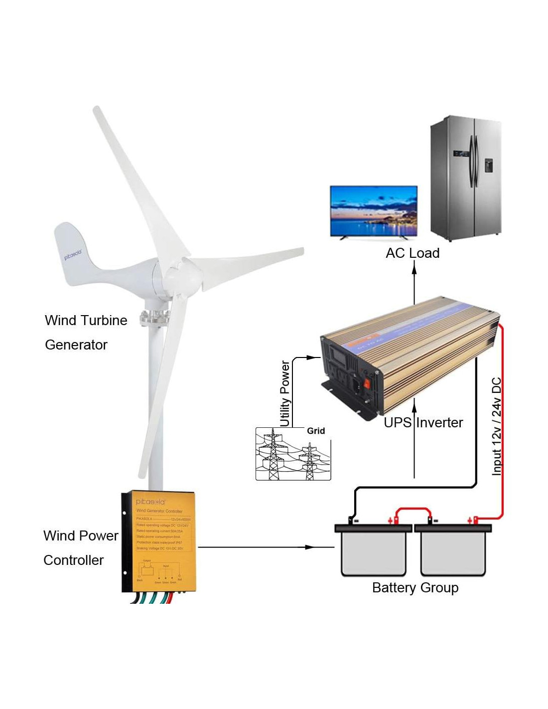 - 2. Aspa de viento: 60 cm de longitud, hecha de fibra de carbono de nylon. Cuanto más largas son las aspas, más energía cinética generan y más potencia producen. Material de nylon impermeable, resistente a la corrosión, ligero, de alta eficiencia.