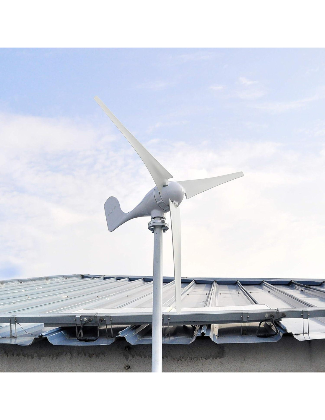 - 1. Principio: generador eólico de eje horizontal, se refiere a la instalación horizontal del eje, paralelo al suelo. El viento impulsa las aspas para generar energía cinética, que a su vez impulsa el motor para generar electricidad. Componentes principales: aspa + generador (motor) + cuerpo rotativo + cola de viento
