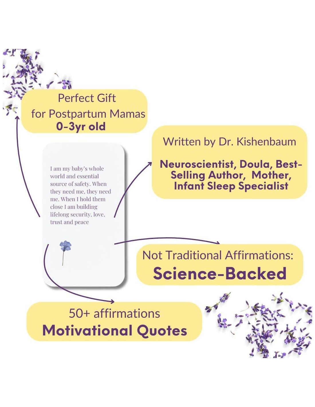 - Respaldadas por neurociencia y experiencia real de maternidad Creado por la Dra. Greer Kirshenbaum, PhD, cada tarjeta combina más de 15 años de neurociencia con su propio viaje de maternidad. Diseñadas para ayudar a las mamás a reducir el estrés y reconectarse con ellas mismas.