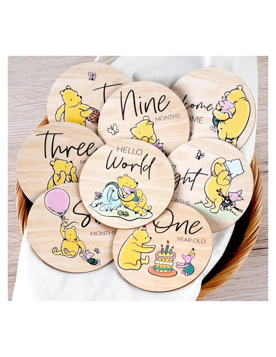 - Presentamos nuestras Tarjetas de Hitos de Madera Reutilizables para Bebés - una adición atemporal a la decoración de su guardería con temática de Winnie the Pooh, diseñadas para capturar y preservar los momentos preciosos del primer año de su bebé o decoraciones para la fiesta de baby shower.