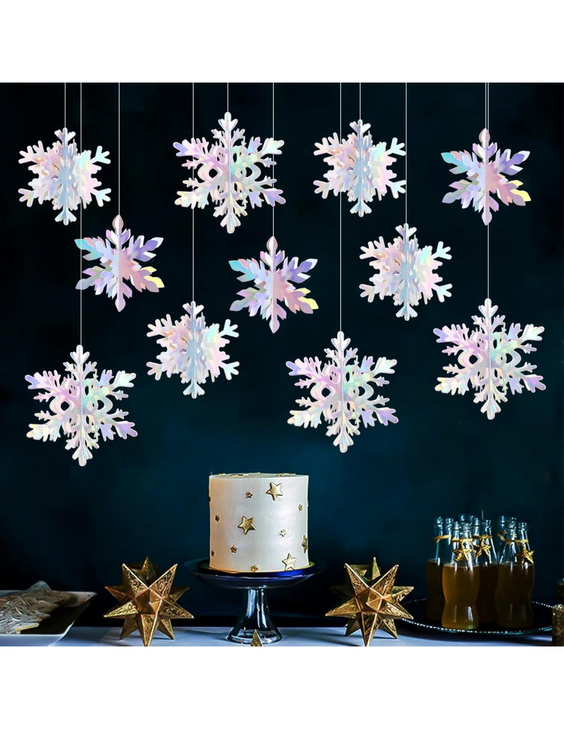 - [Paquete Incluye] Obtendrás 12 piezas de guirnaldas de copos de nieve 3D holográficos iridiscentes de 4.7" (11.94 cm), que hacen que tu fiesta sea más vibrante y con mejor ambiente.
