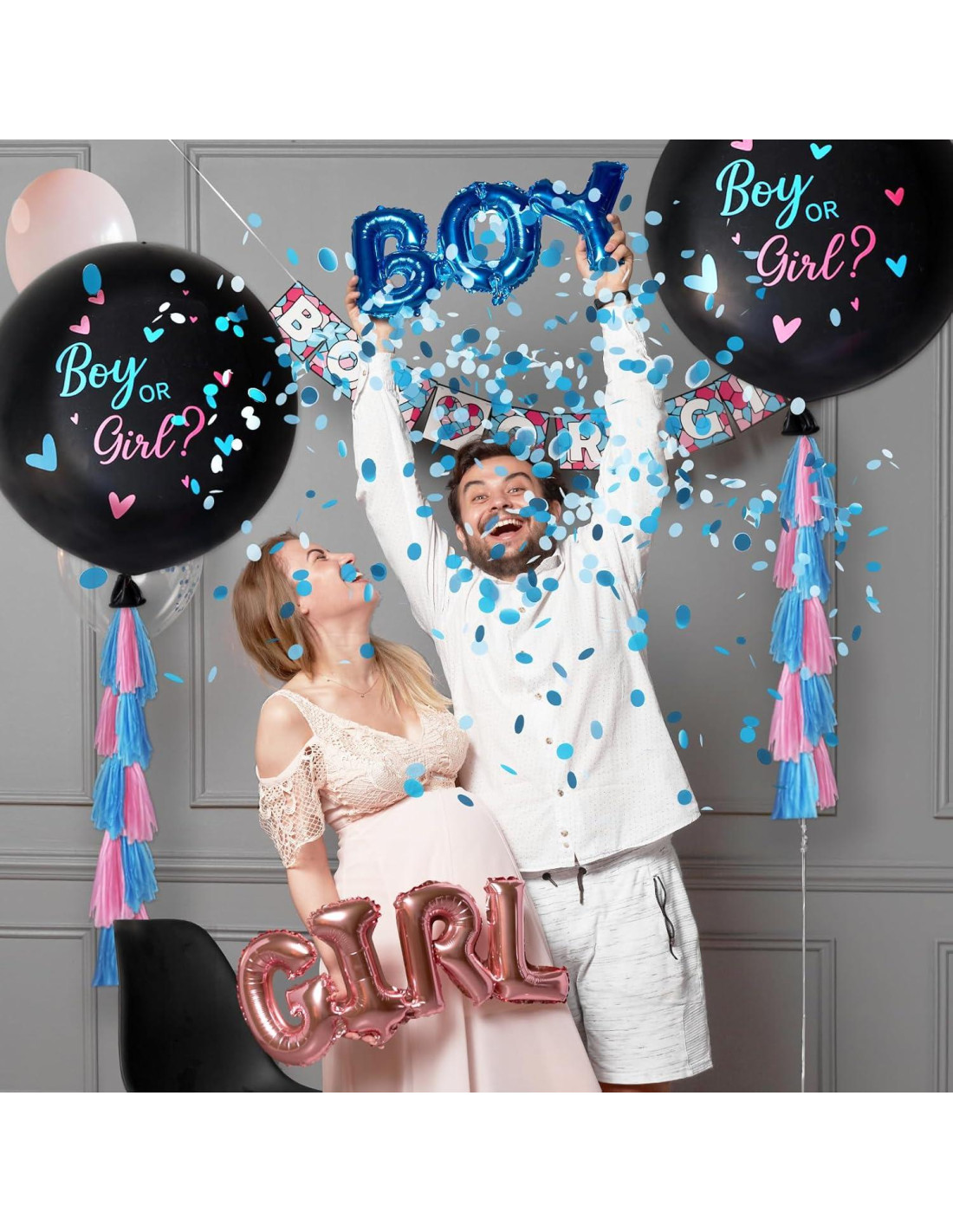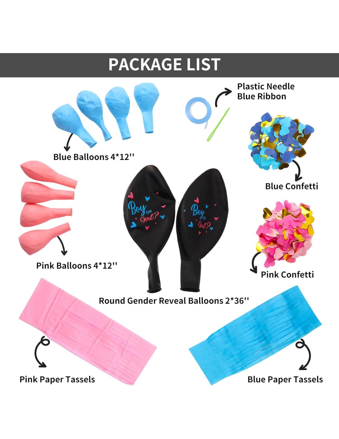 - Kit de Globos para Revelación de Género: El paquete incluye 2 globos de látex negros gigantes "niño o niña", 1 paquete de confeti rosa, 1 paquete de confeti azul, 1 paquete de borlas de papel rosa, 1 paquete de borlas azules, 1 cinta, 1 aguja de plástico, 4 globos rosa de 12 pulgadas (30,48 cm) y 4 globos azules de 12 pulgadas (30,48 cm)