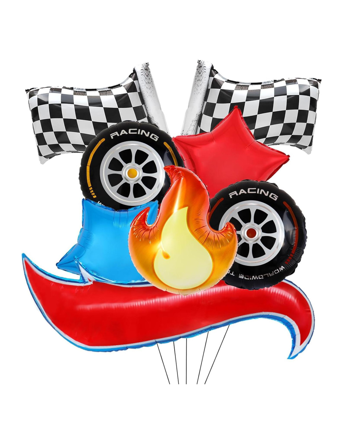 - Contenido del Paquete/8Pcs 1 globo en forma de llama, 2 globos en forma de estrella, 2 globos en forma de banderas a cuadros, 2 globos en forma de rueda de neumático, 1 globo de banner, 1 popote, 1 rollo de cinta lateral
