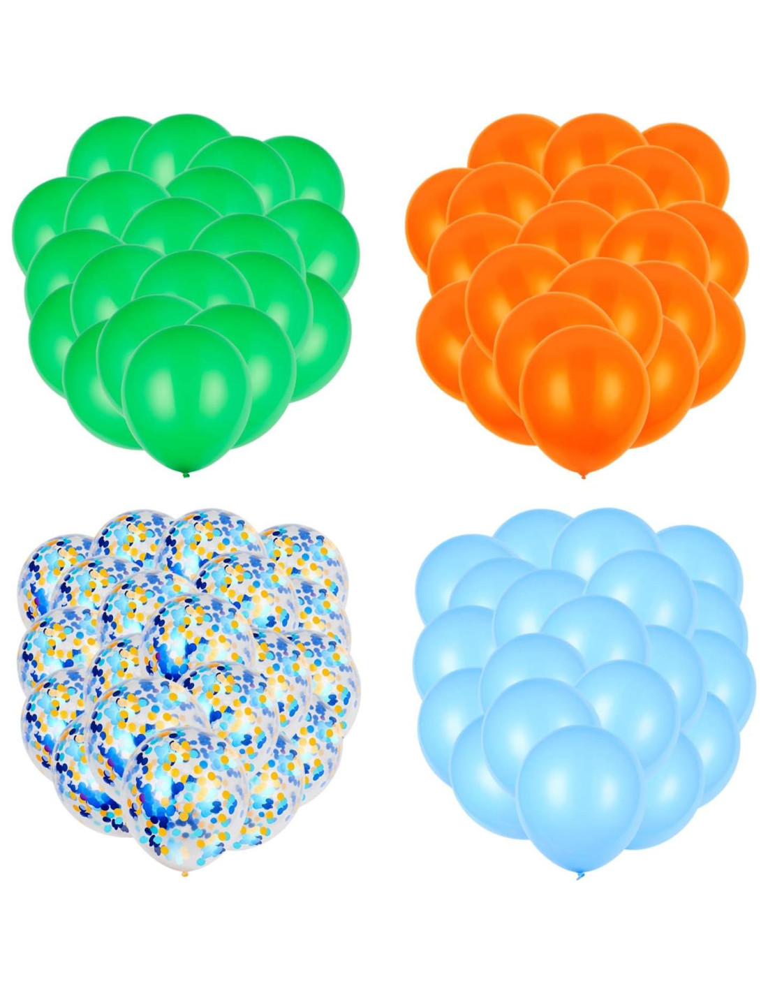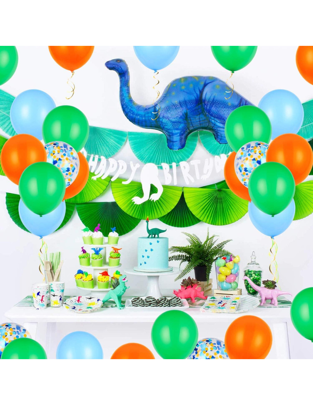 - Paquetes de globos para fiesta de dinosaurios todo en uno: 20 globos de látex naranjas, 20 globos de látex azules, 20 globos de látex verdes frutales, 20 globos de confeti (naranja, azul y verde frutal), 1 herramienta para atar globos, 2 cintas verdes de 16 pies (4,88 m), 2 cintas doradas de 16 pies (4,88 m)