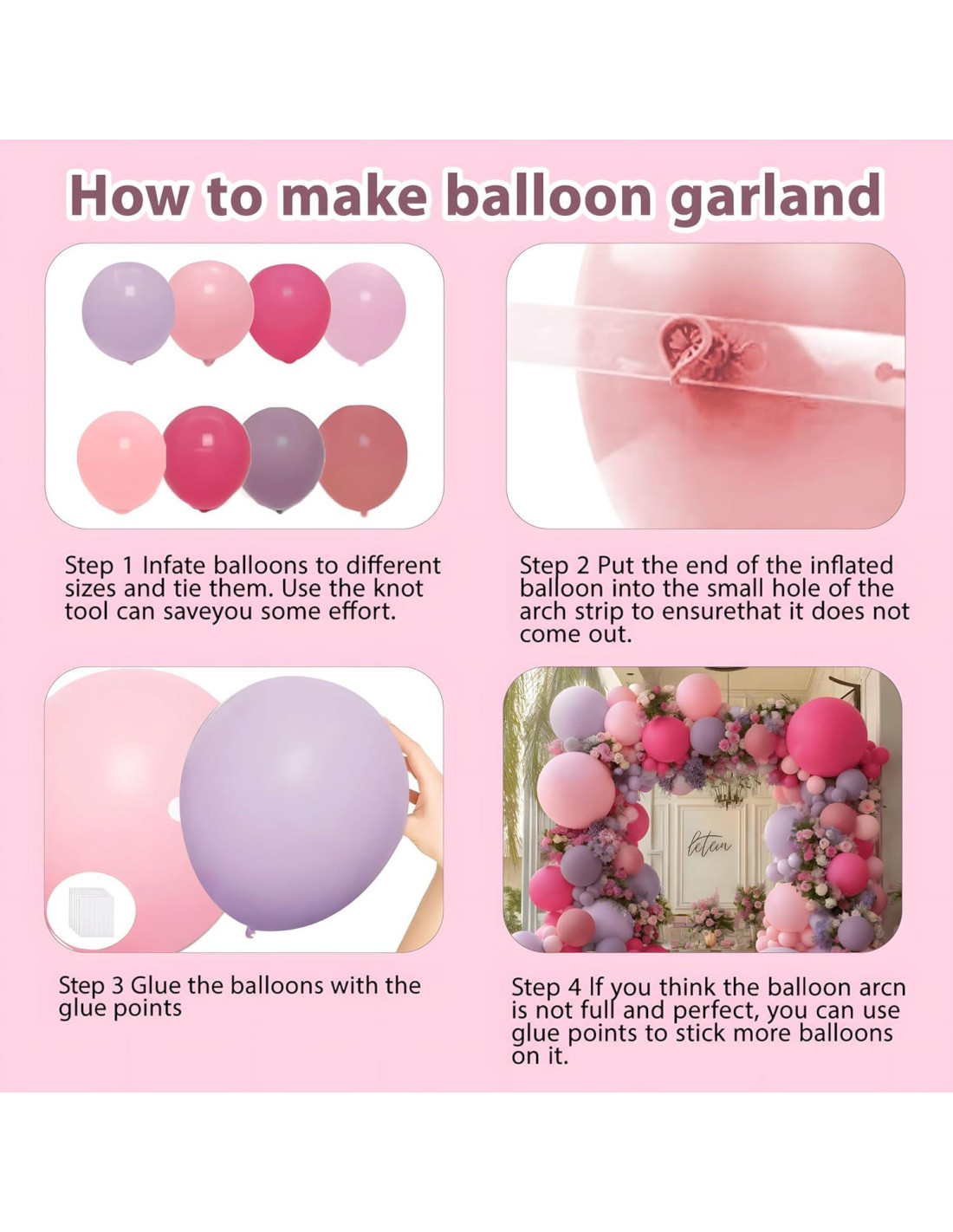 - Arco de Globos Rosa Fucsia Púrpura: 33 piezas de globos doble relleno: globos rosa bebé (18in x 1, 12in x 10), globos rosa fucsia (18in x 1, 12in x 10), globos lavanda (18in x 1, 12in x 10); 81 piezas de globos de una sola capa: rosa polvoriento (10in x 10), púrpura polvoriento (10in x 10), lila (10in x 8, 5in x 15), rosa bebé (10in x 8, 5in x 15), rosa fucsia (5in x 15). 1 rollo de cinta para globos, 5 piezas de pegatinas para globos. Si deseas lograr un arco más lleno como en la imagen, se recomienda comprar 2-3 paquetes.