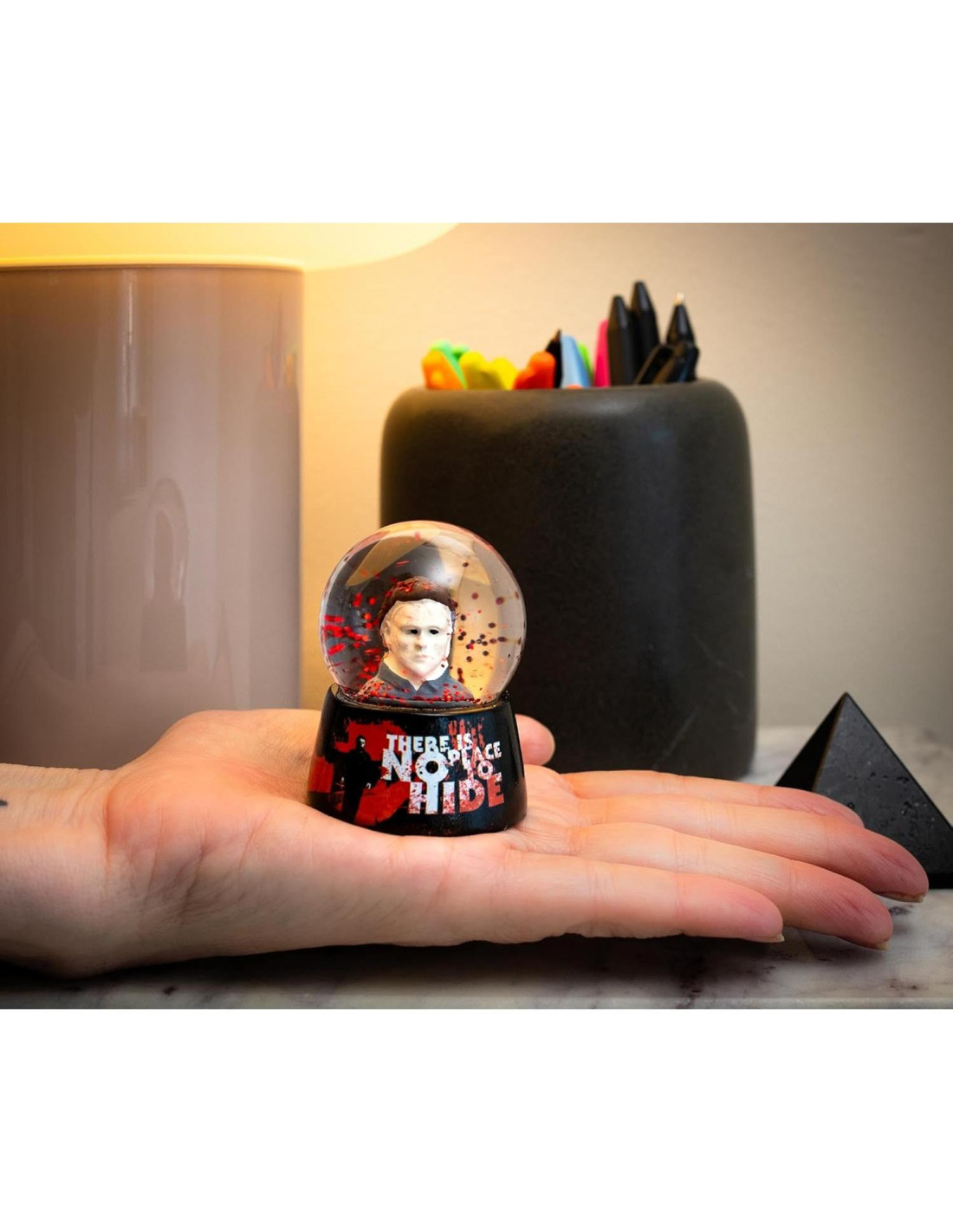 - CARACTERÍSTICAS UN DISEÑO ASESINO: El asesino enmascarado puede estar atrapado dentro de este globo de agua brillante, pero la base ensangrentada de este espeluznante recuerdo coleccionable entrega una advertencia de que "No Hay Lugar para Esconderse."