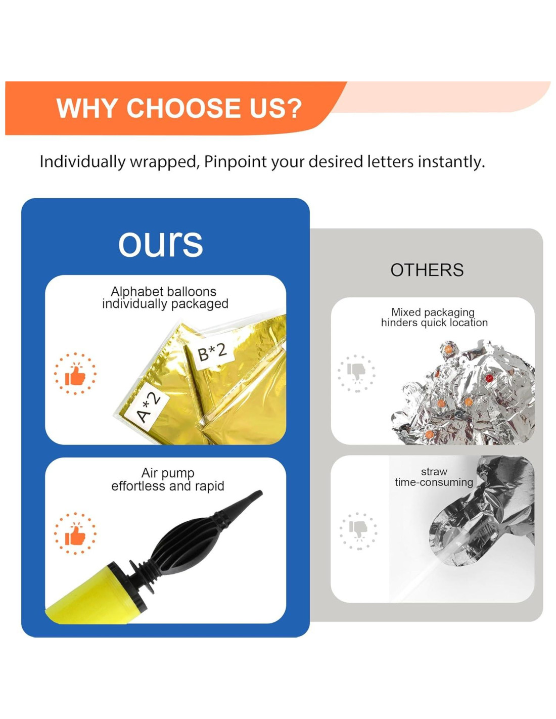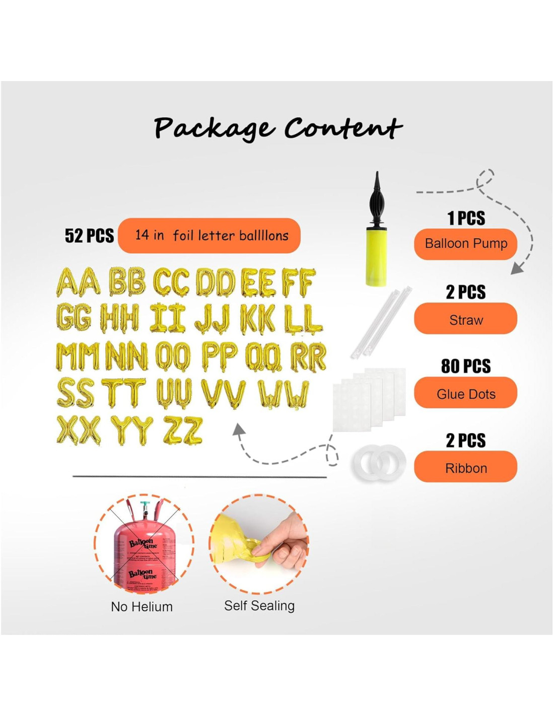 - Posibles accesorios: Recibirás 2 conjuntos completos de globos de 26 letras, 1 bomba infladora, 2 popotes, 80 puntos de pegamento para fijación en la pared, o 2 rollos de cinta para colgar, teniendo en cuenta todos los artículos necesarios para ti