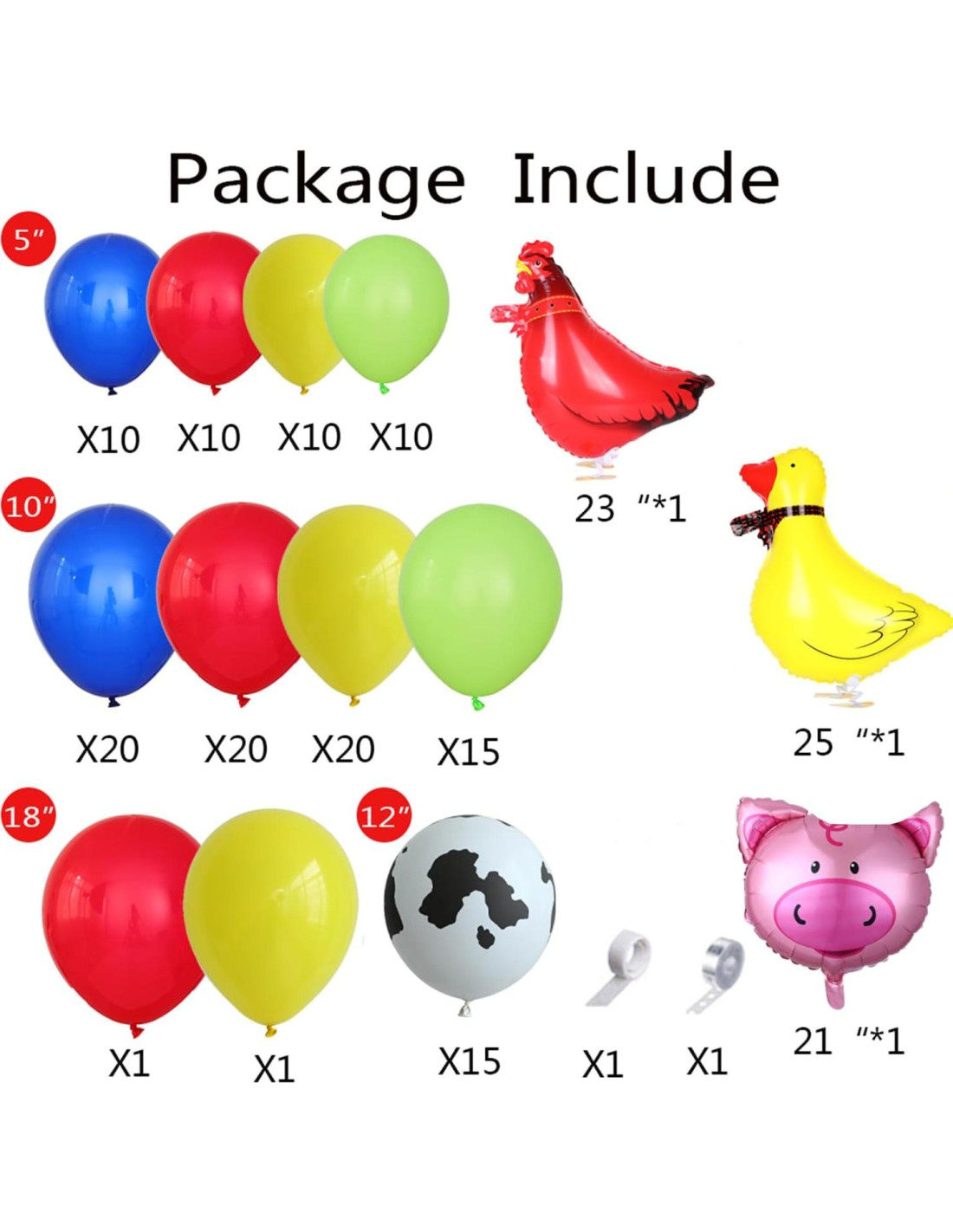 Paquete Incluye: 30 globos azul real 31 globos amarillos 31 globos rojos 25 globos verdes 15 globos con estampado de vaca 4 globos de foil de animales 1 cinta de tira para arco de globos 1 rollo de 100 pegatinas de punto