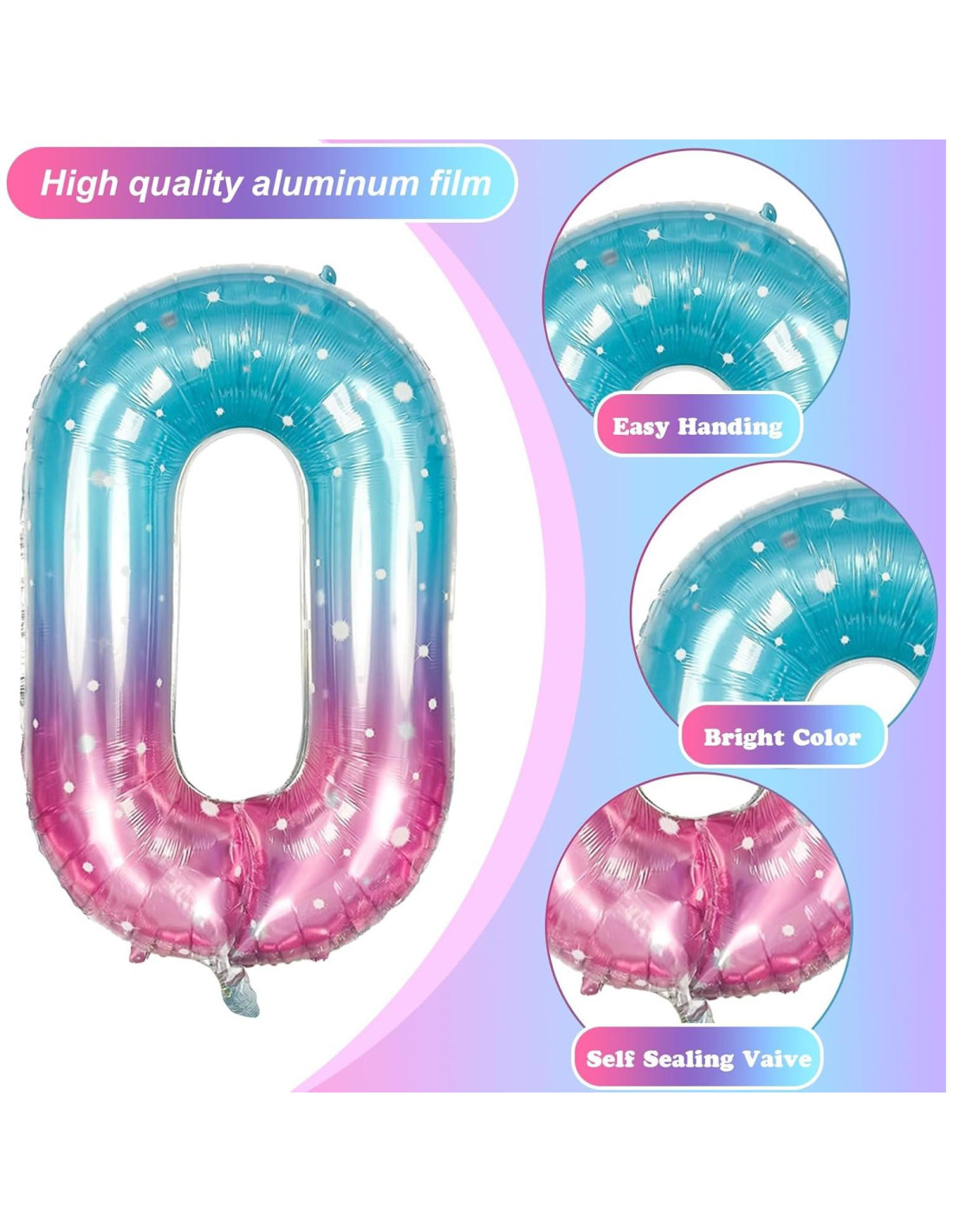 - Globos de Número 0 Sirena: Los globos de número en color degradado azul y rosa miden 40" (101,6 cm), perfectos para decoraciones de fiestas de cumpleaños. Tenemos globos de número de helio del 0 al 9, puedes comprar cualquier número y combinarlos con otros globos de número, dejando una impresión memorable en las fiestas de cumpleaños de niñas y mujeres y eventos especiales.
