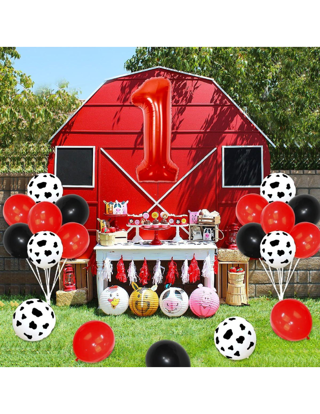 - Fiesta de Tema de Granja Todo en Uno: Nuestros suministros para la fiesta de cumpleaños de granja incluyen 50 globos de látex de 12 pulgadas (20 rojos, 15 negros y 10 con manchas de vaca blancas, 5 blancos), 16 globos de látex de 5 pulgadas (8 rojos y 8 negros), 1 set de tela de fondo de 1 año, 1 globo de aluminio número 1, 1 cadena de globos, 1 rollo de puntos adhesivos transparentes de doble cara.
