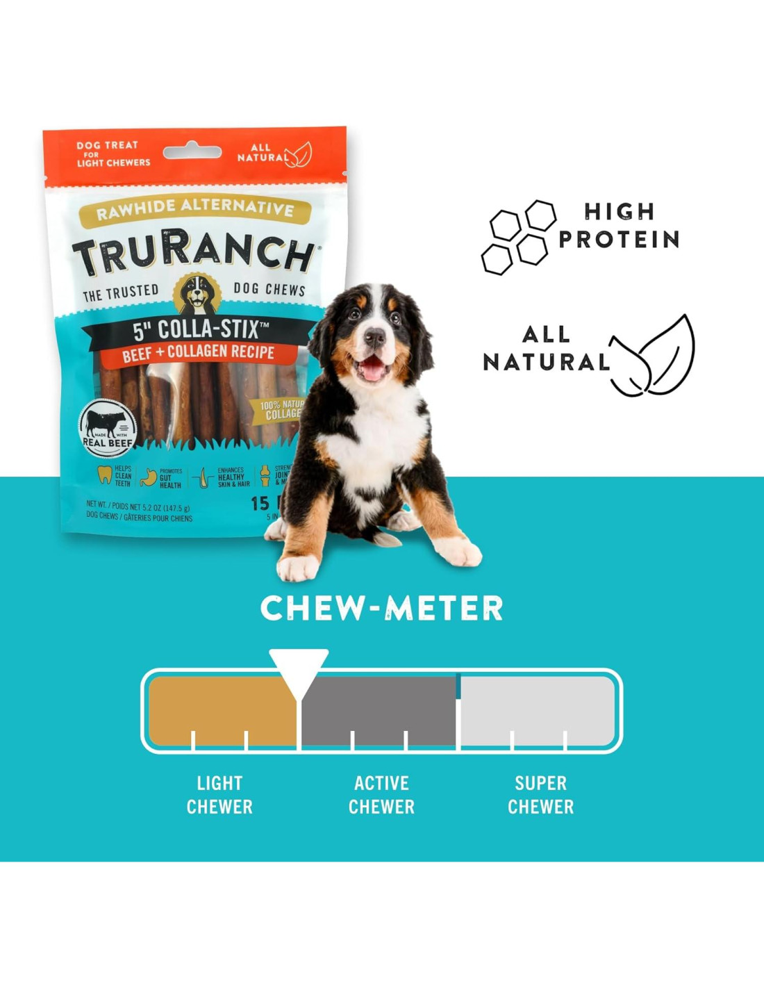 - Apoya la Higiene Dental: La textura única de los Palitos de Colágeno TRURANCH ayuda a raspar la placa y el sarro, promoviendo dientes y encías saludables. Masticar regularmente ayuda a mantener el aliento de su perro más fresco y la salud dental bajo control.