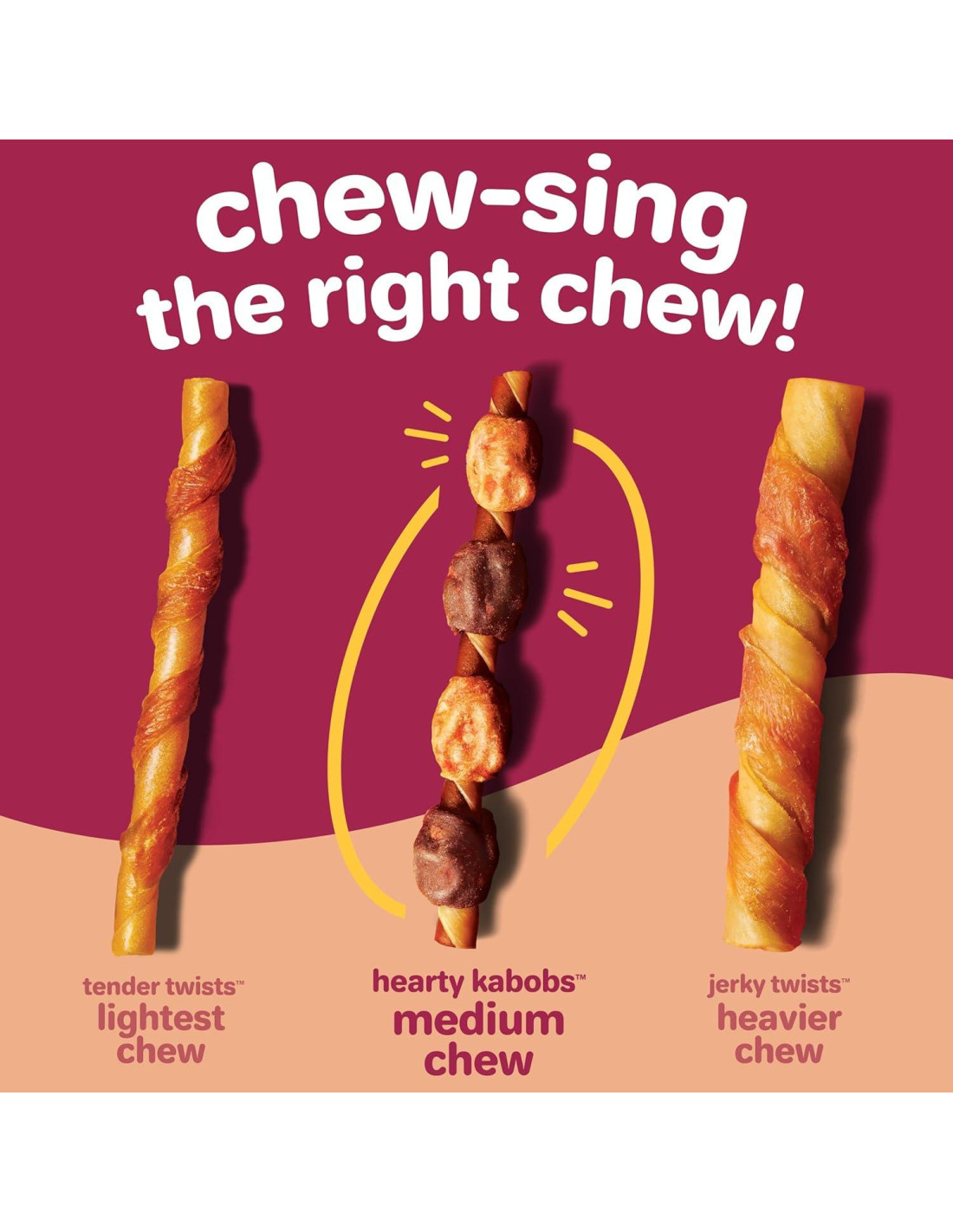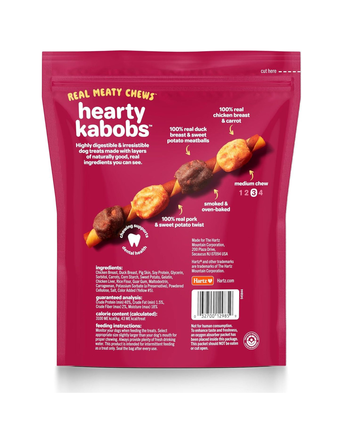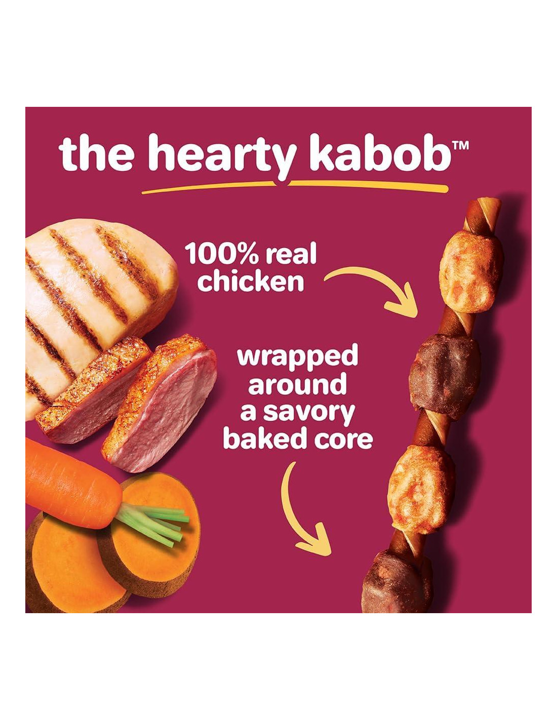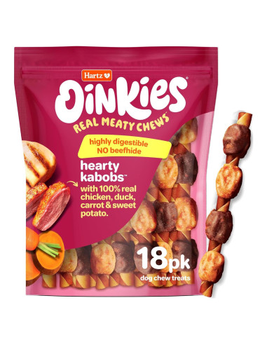 Hartz Oinkies Meathouse 'n' Veg Hearty Kabobs son golosinas para perros altamente digestibles e irresistibles hechas con capas de ingredientes reales y naturalmente buenos que puedes ver. No contiene piel de res ni piel de res, el núcleo de torcedura de cerdo real y batata está cargado de trozos de pechuga de pollo real y albóndigas de zanahoria y pechuga de pato real y albóndigas de batata. Estas golosinas para perros son ahumadas y horneadas para sellar ese delicioso sabor por el que tu perro se volverá loco. Oinkies Hearty Kabobs se consideran un masticable de tamaño mediano.
