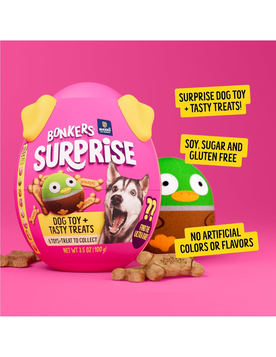 - COMBINACIÓN DE GOLOSINA Y JUGUETE: Cada huevo BONKERS Sorpresa contiene galletas para perros sabrosas y horneadas, y un juguete de peluche para traer el doble de diversión