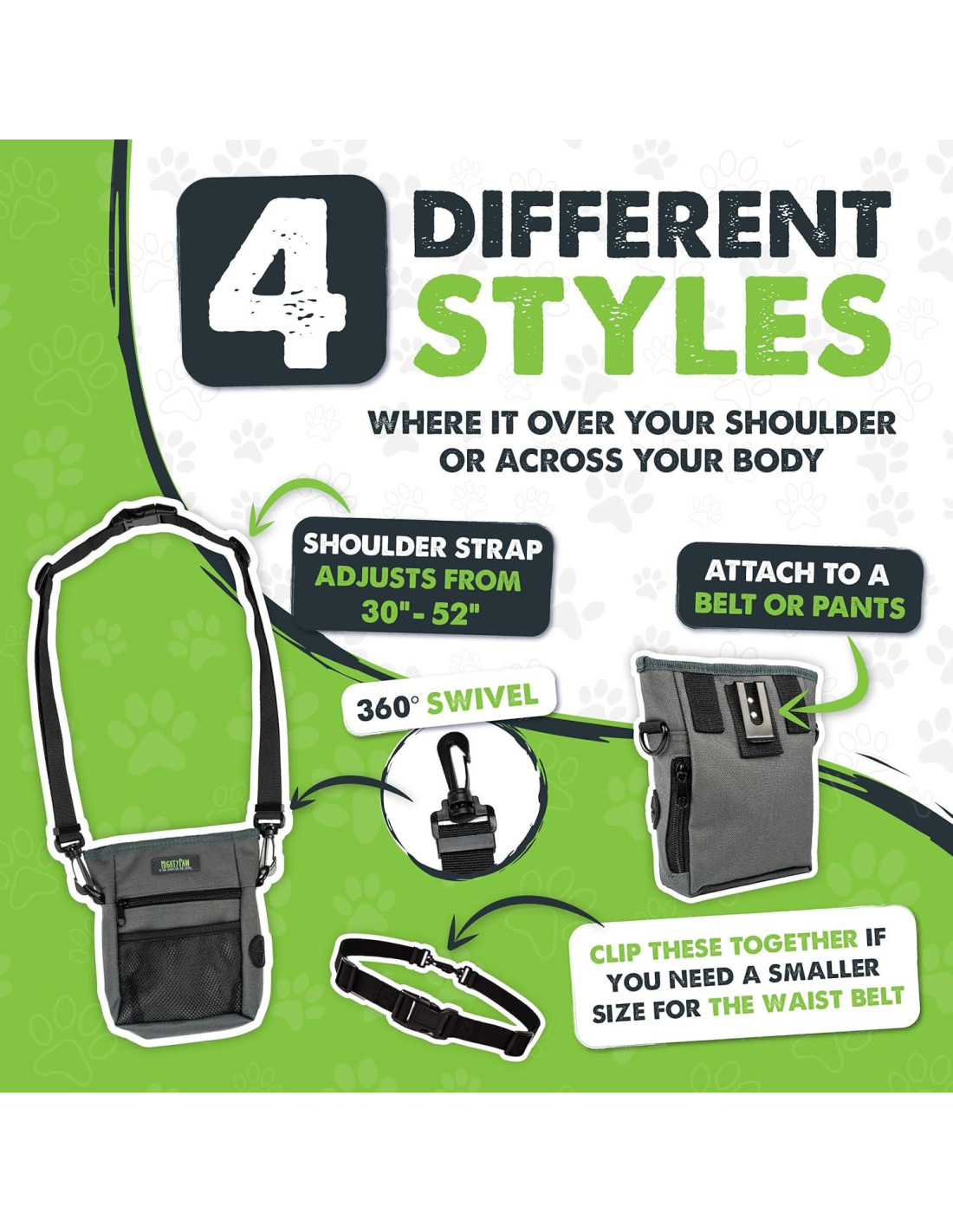 - ¡Cabe Todo lo que Necesitas!: ¡Esta es la última bolsa para pasear perros que necesitarás! Con dimensiones de 7" x 2.5" x 5" (17,78 cm x 6,35 cm x 12,7 cm), nuestra bolsa de golosinas tiene 4 compartimentos de almacenamiento para hasta 2 tazas de golosinas y hasta un lugar para tu teléfono, billetera y/o llaves!