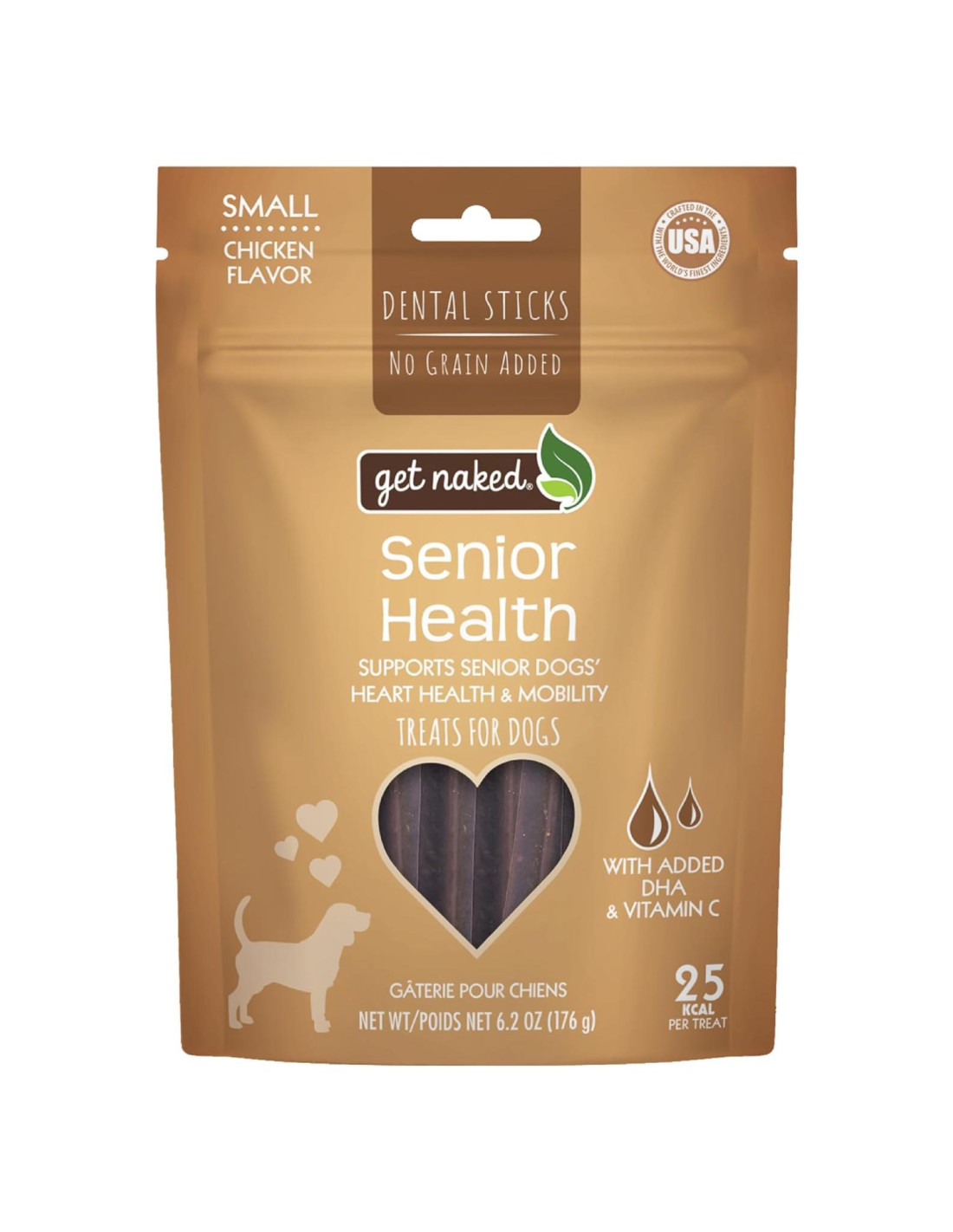 ¡Ayuda a apoyar la edad dorada de tu amigo peludo con los Palitos Masticables Dentales Salud Senior Get Naked! Estos sabrosos premios están formulados especialmente con calcio para apoyar dientes y huesos saludables, también se agregó mejillón de labios verdes para proporcionar soporte antiinflamatorio y de cartílago. Estos palitos de salud senior ayudan a mantener una vida saludable para que se sienta lo mejor posible. ¡Estos premios con sabor a pollo también son sin granos y ayudan a reducir la acumulación de placa y sarro mientras tu perro mastica! ¡Mima a tu cachorro con un bocadillo nutritivo con estos deliciosos palitos masticables dentales!