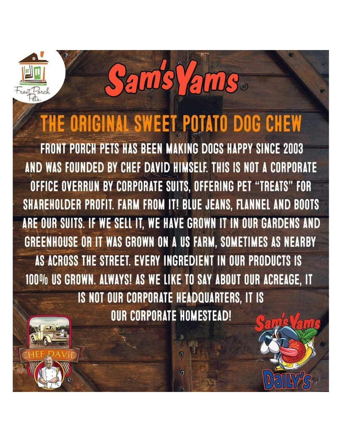 - GRANDES PERROS, GRAN NUTRICIÓN: Dale a tu perro un gran dosis de amor con los masticables de batata Sam's Yams Big Boyz! El masticable de batata original, creado por el Chef David y comenzó a vender Sam's Yams en mercados agrícolas en 2003. Estos masticables están llenos de vitaminas esenciales como A, B6 y C, además de minerales como calcio, potasio, fósforo, hierro. Mantén a tu gran perro saludable y feliz con un masticable vegano bajo en calorías y rico en antioxidantes que ofrece gran nutrición en cada bocado!