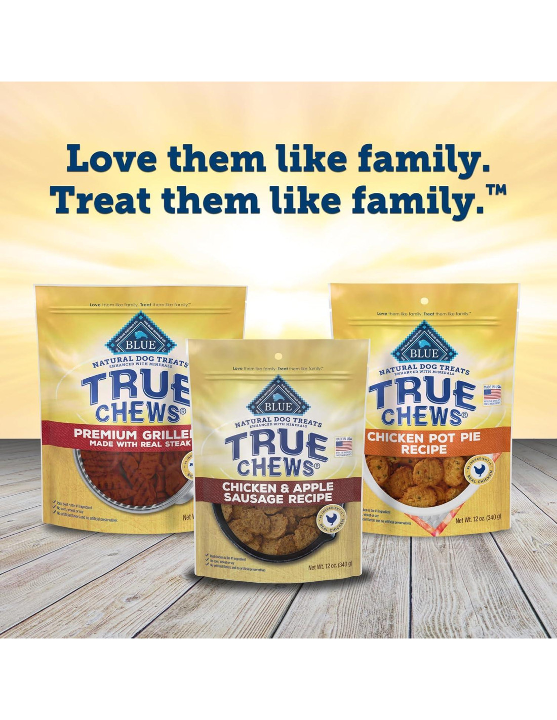 - Contiene: Una (1) bolsa de 340 g de Golosinas Masticables Naturales BLUE True Chews; Receta de Salchicha de Pollo y Manzana
