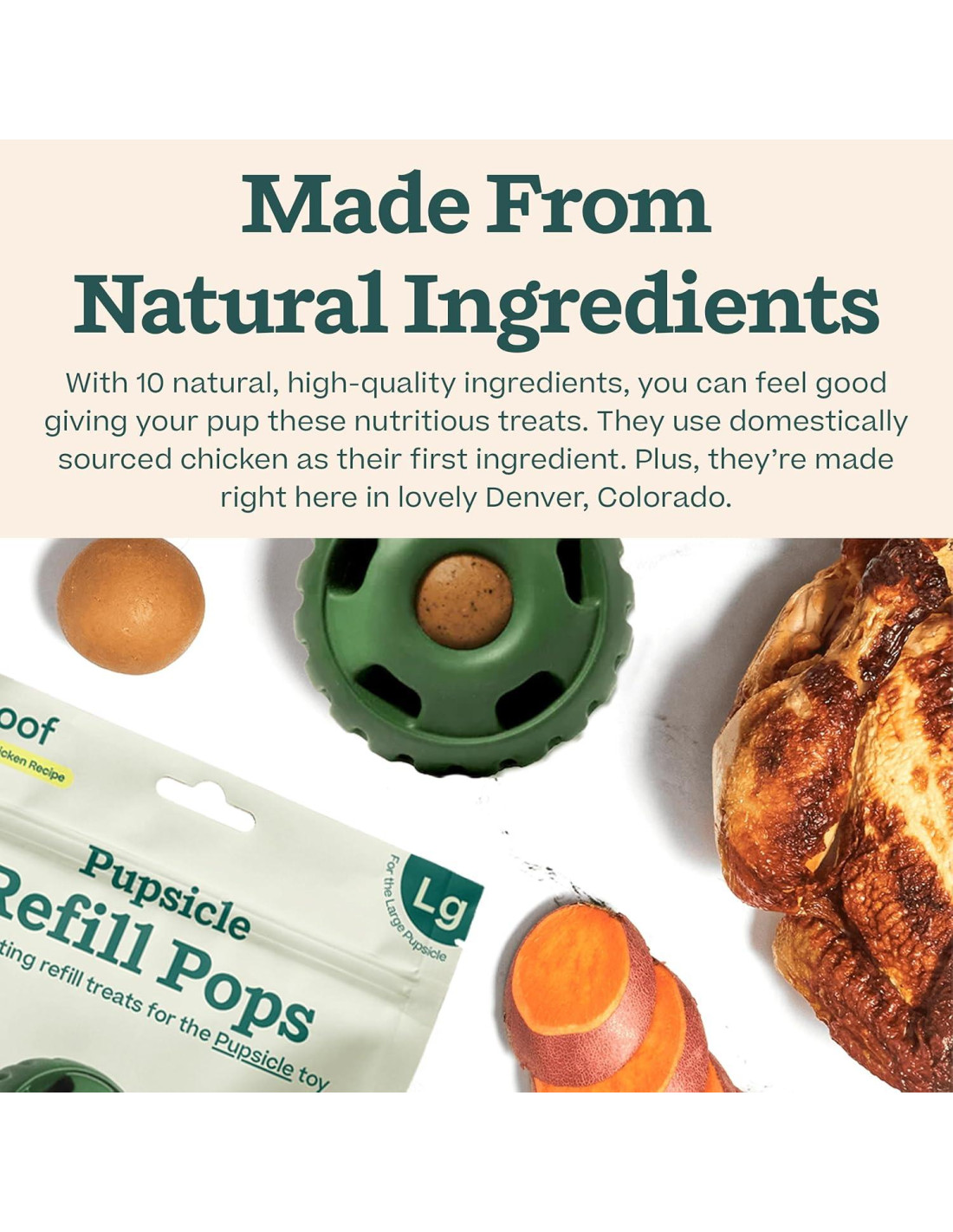 - Pre-Hechos Para Menos Desorden: Los Pops de Recarga Pupsicle son una alternativa conveniente y nutritiva a congelar premios para el Pupsicle. No más preparar premios congelados horas antes de necesitarlos. No más sacar mantequilla de maní en juguetes de premios desordenados. Los Pops están listos para usar, no requieren refrigeración, y son premios para perros que a todos los cachorros les encantan.