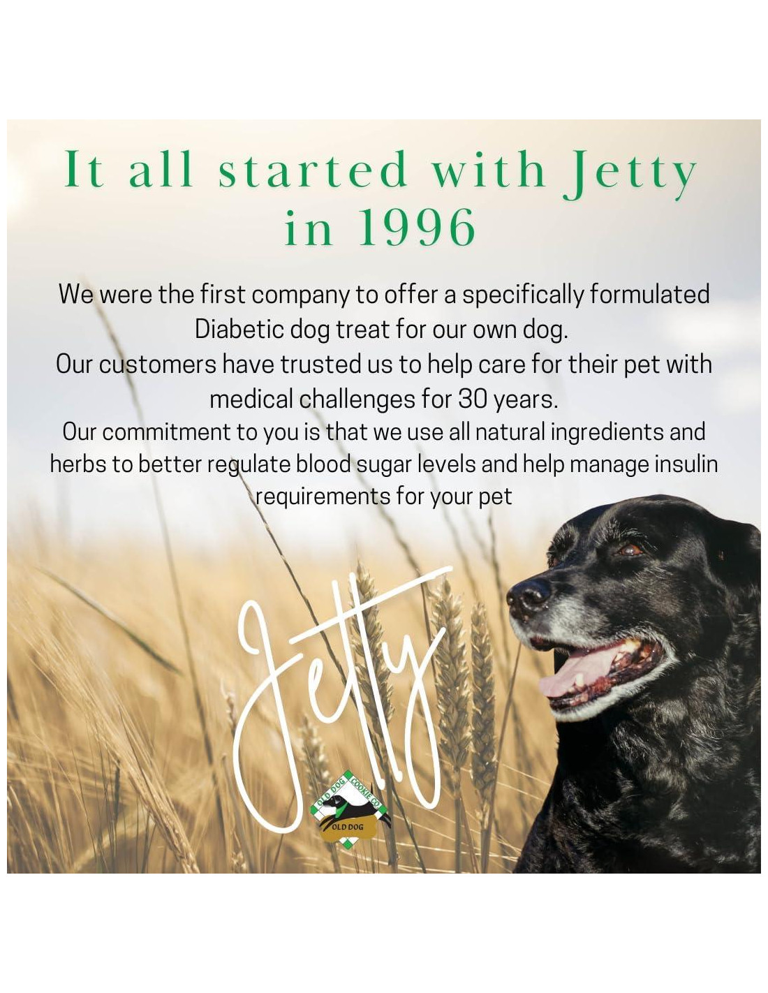 Nuestras Galletas para Perros TINY Diabéticas ofrecen grandes beneficios en un pequeño bocado de 2 calorías. Especialmente formuladas para perros diabéticos, estas galletas 100% naturales cuentan con hierbas curativas que ayudan a regular el azúcar en la sangre, apoyan la gestión de insulina y refuerzan el sistema inmunológico de tu perro. Sus ingredientes prebióticos son suaves para estómagos sensibles y están libres de azúcares, sal y conservantes químicos. Hechas con ingredientes de calidad humana, de origen en EE. UU., nuestras galletas son bajas en calorías, de bajo índice glucémico y bajas en proteínas para promover el bienestar general. Estas pequeñas galletas no son solo para perros diabéticos, son perfectas como un premio de entrenamiento o un bocadillo saludable para cualquier perro. Desarrolladas con la guía de veterinarios y confiadas durante más de 30 años, promueven el bienestar y apoyan una mejor calidad de vida para todos los perros. En Old Dog Cookie Company, nuestro viaje comenzó con nuestro propio perro diabético, Jetty, porque cuando tratas mejor, vives mejor.