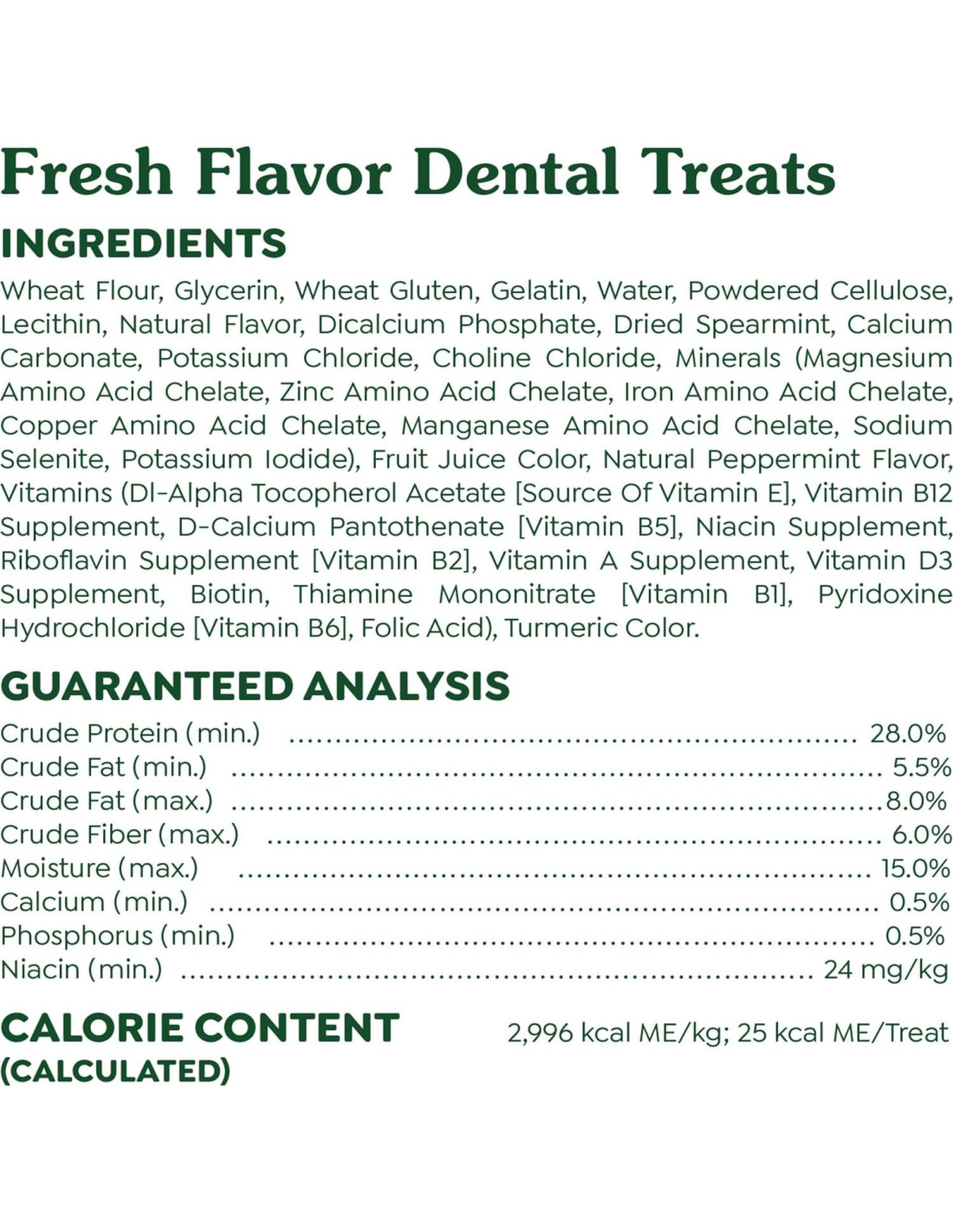 - Golosinas Dentales de Menta Fresca para Perros: Una Greenie al día es todo lo que se necesita para dientes limpios, aliento fresco y un perro feliz; Estas sabrosas golosinas están llenas de sabor a menta que refresca el aliento, con una textura maravillosamente masticable que combate la placa y el sarro