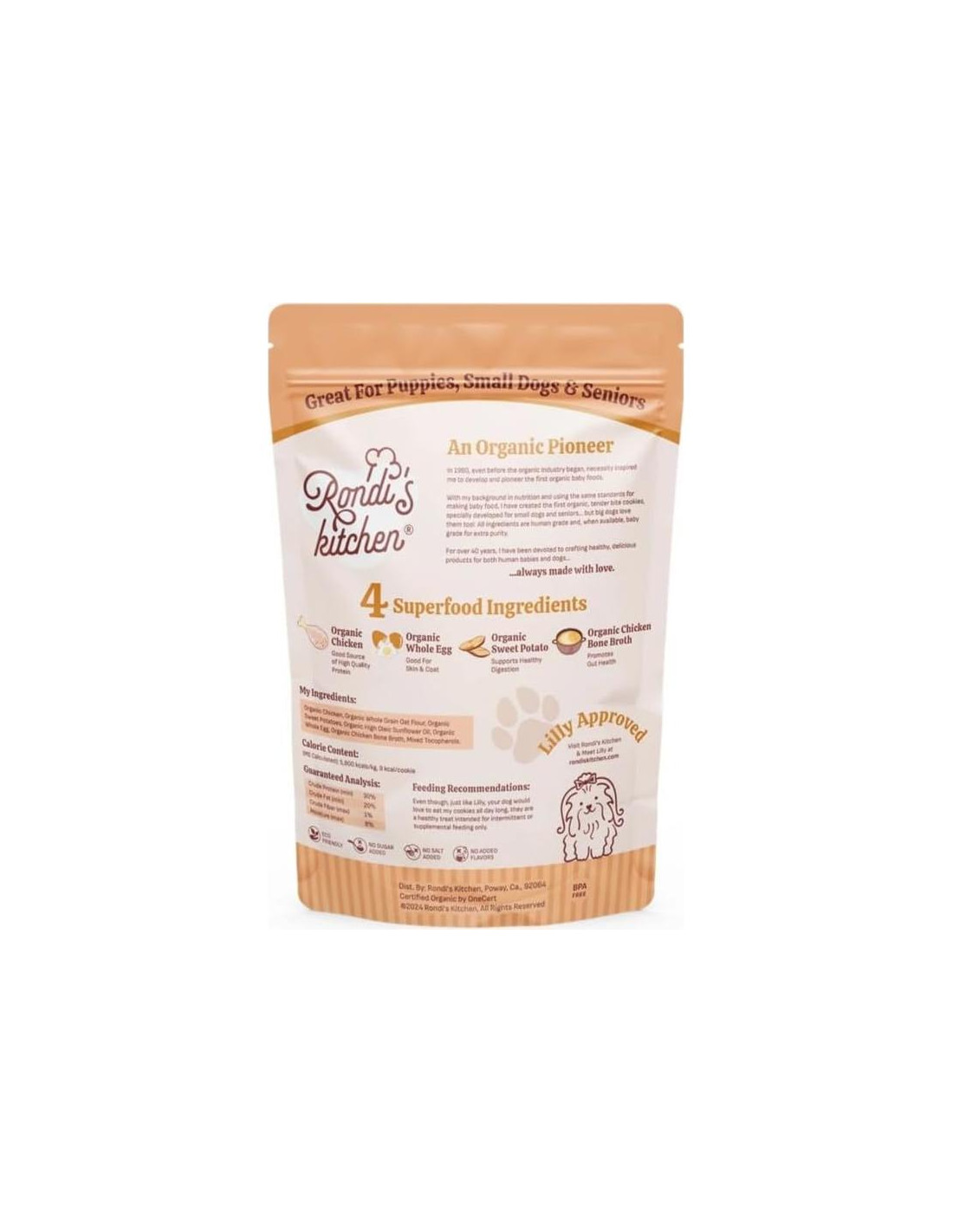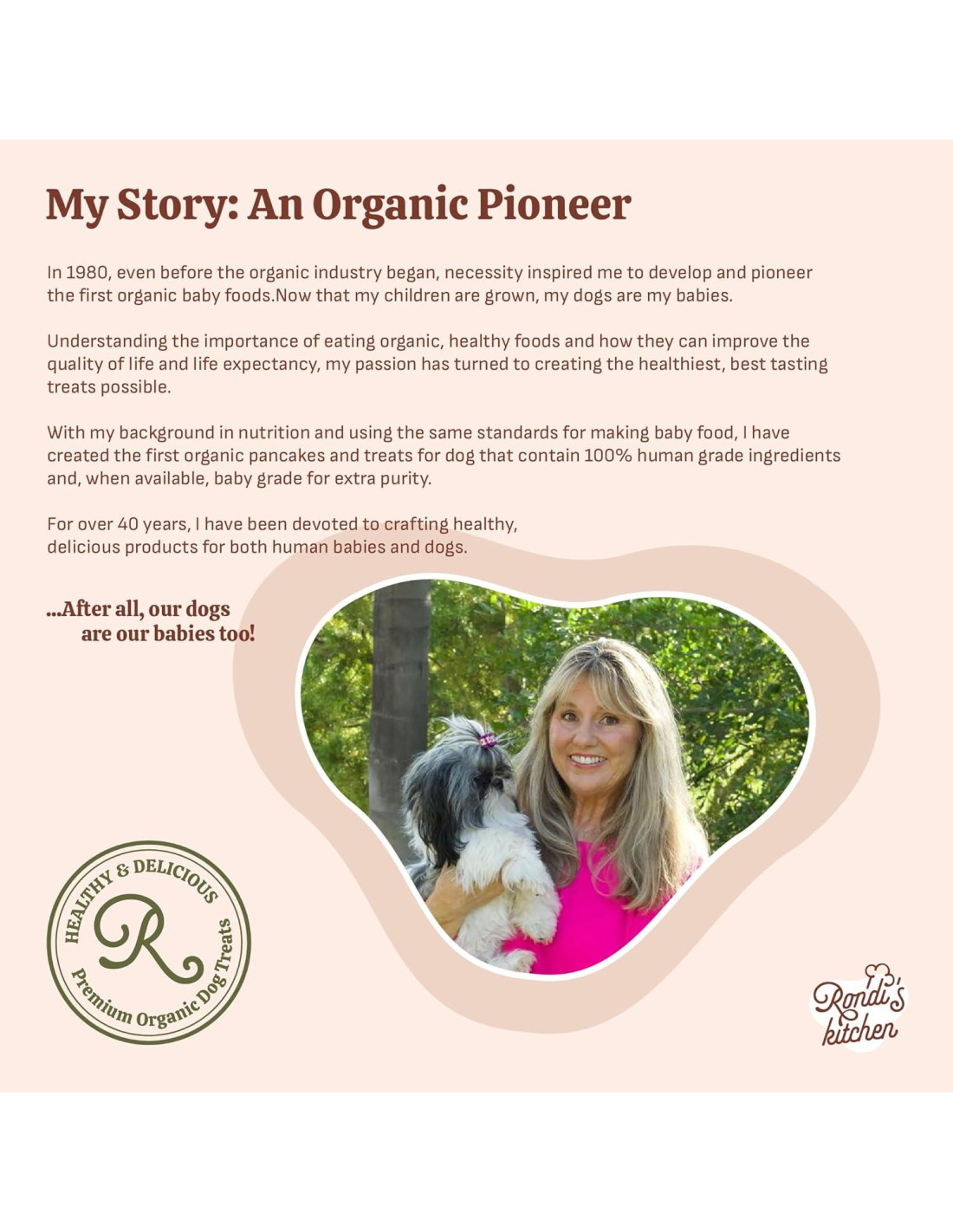 En 1980, incluso antes de que comenzara la industria orgánica, la necesidad me inspiró a desarrollar y pionero los primeros alimentos orgánicos para bebés. Usando los mismos estándares para hacer comida para bebés, he creado las primeras Galletas de Mordida Tierna Orgánicas para perros pequeños, cachorros y mayores... ¡pero a los perros grandes también les encantan!