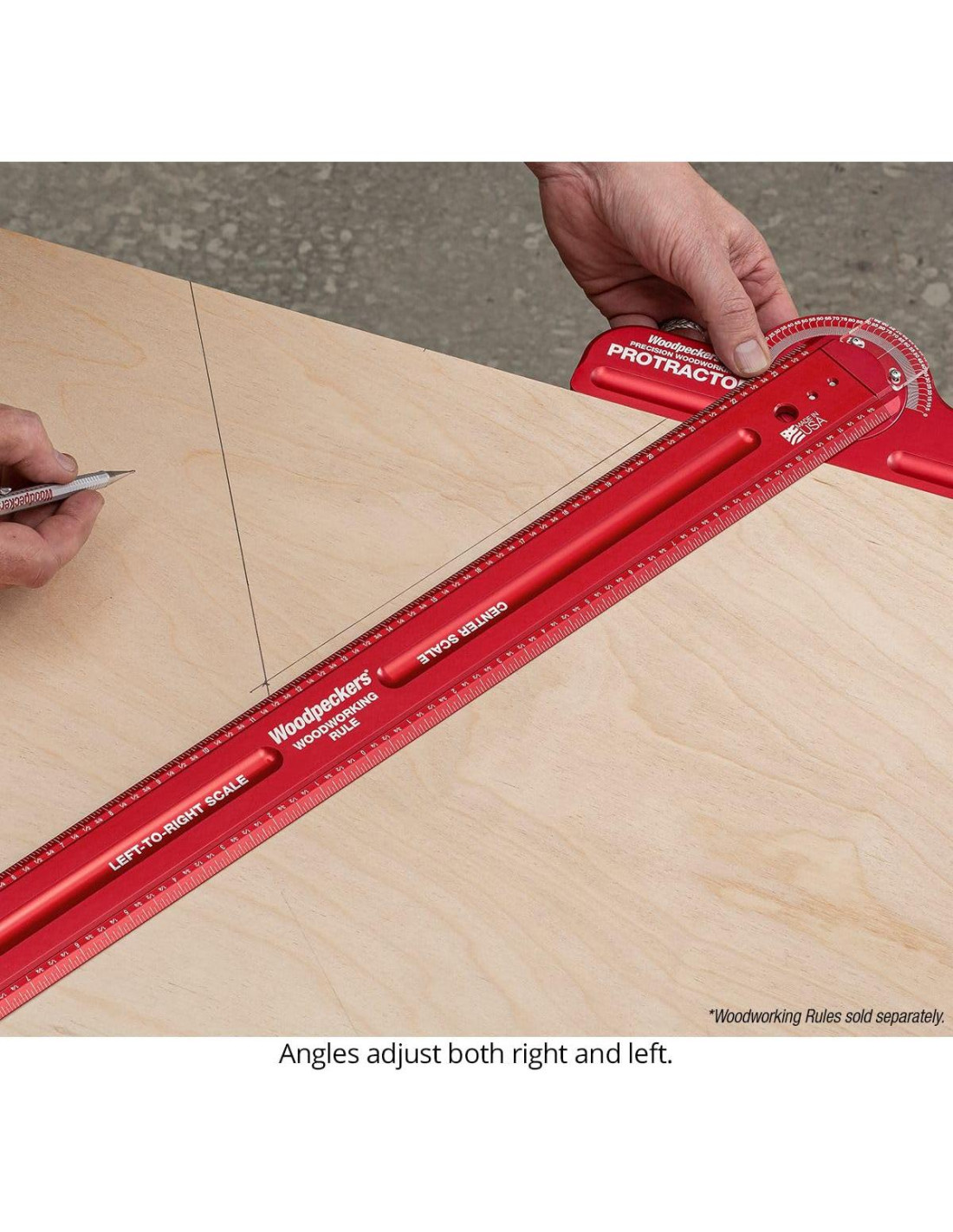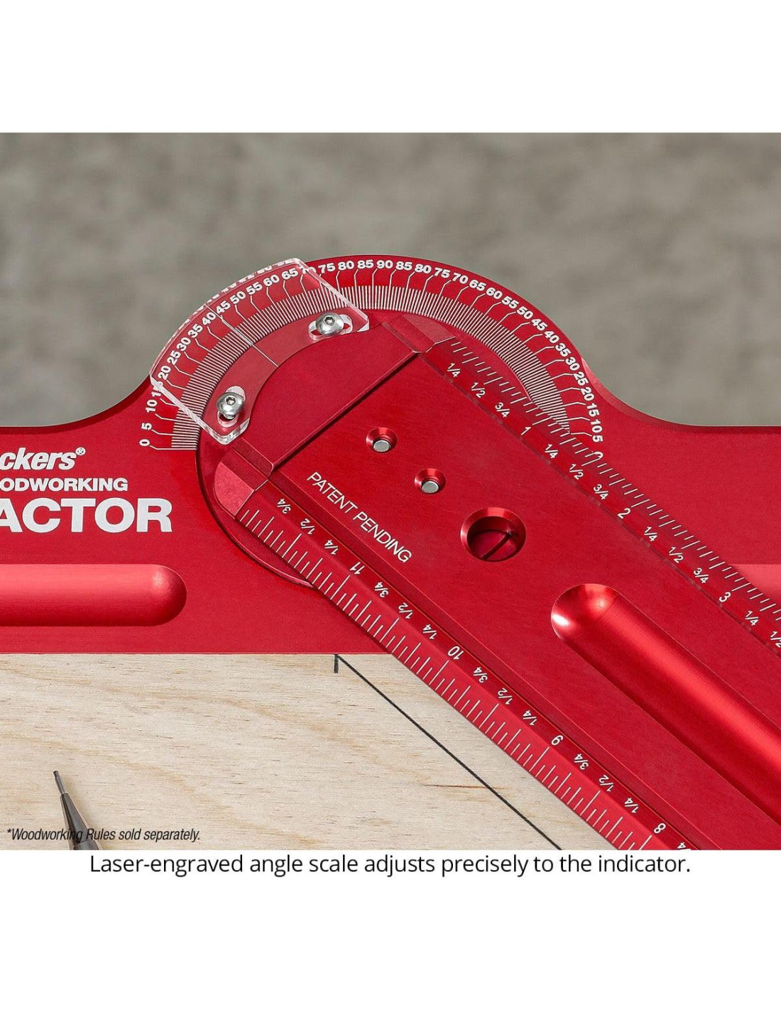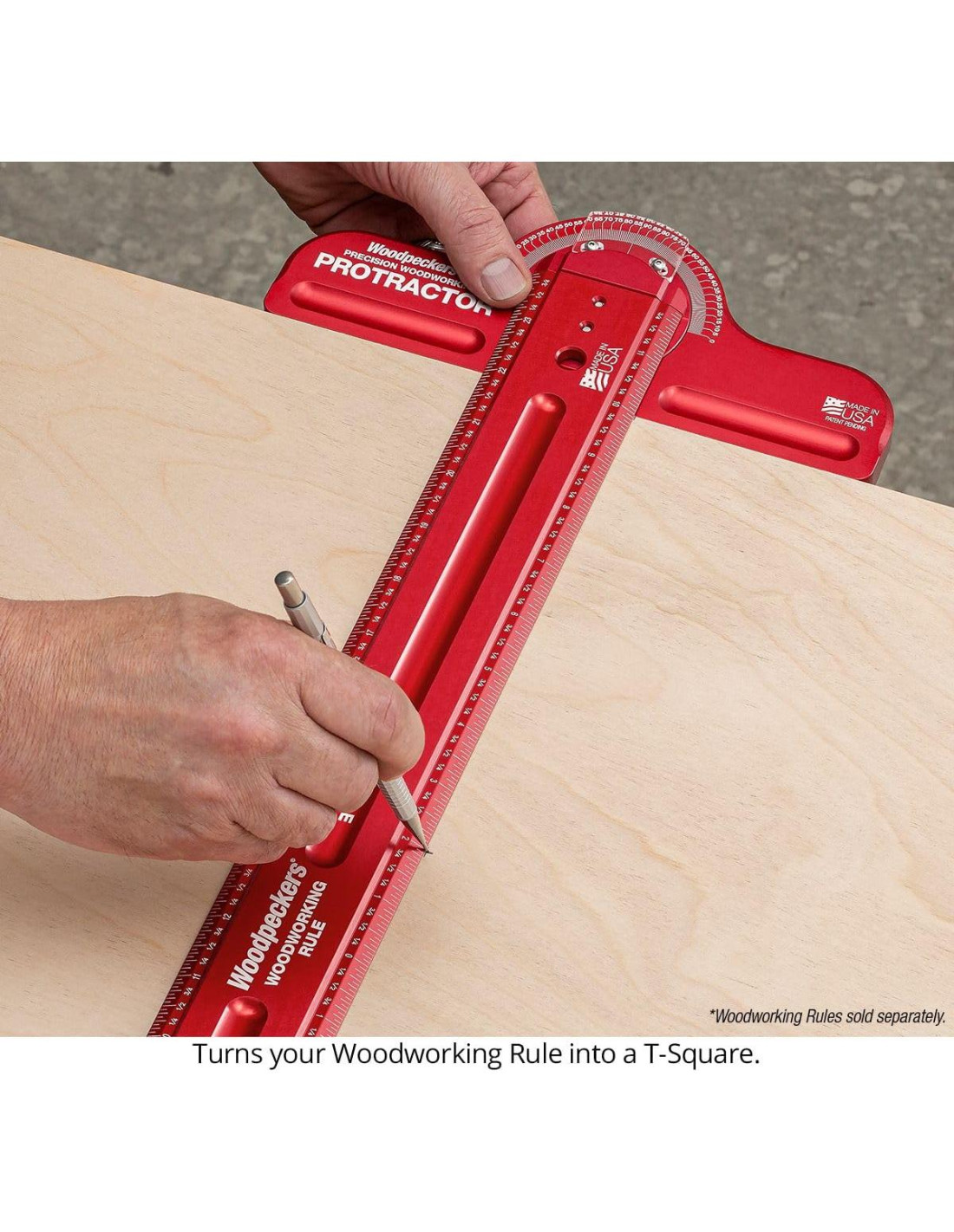 Las reglas de carpintería Woodpeckers han ganado una reputación por su precisión, conveniencia y facilidad de uso. Ahora puedes agregar "versatilidad" a esa lista de características. El transportador de carpintería de precisión Woodpeckers convierte cualquier regla de carpintería Woodpeckers (excepto la de 6 pulgadas (15.24 cm)) en un T-Square ajustable que puede establecer cualquier ángulo de 0 a 180. El transportador de carpintería de precisión se monta simplemente en la regla de carpintería utilizando los mismos agujeros roscados que el tope de gancho. Ahora puedes usar tu regla de carpintería para trazar líneas rectas y anguladas con un alto grado de precisión.
