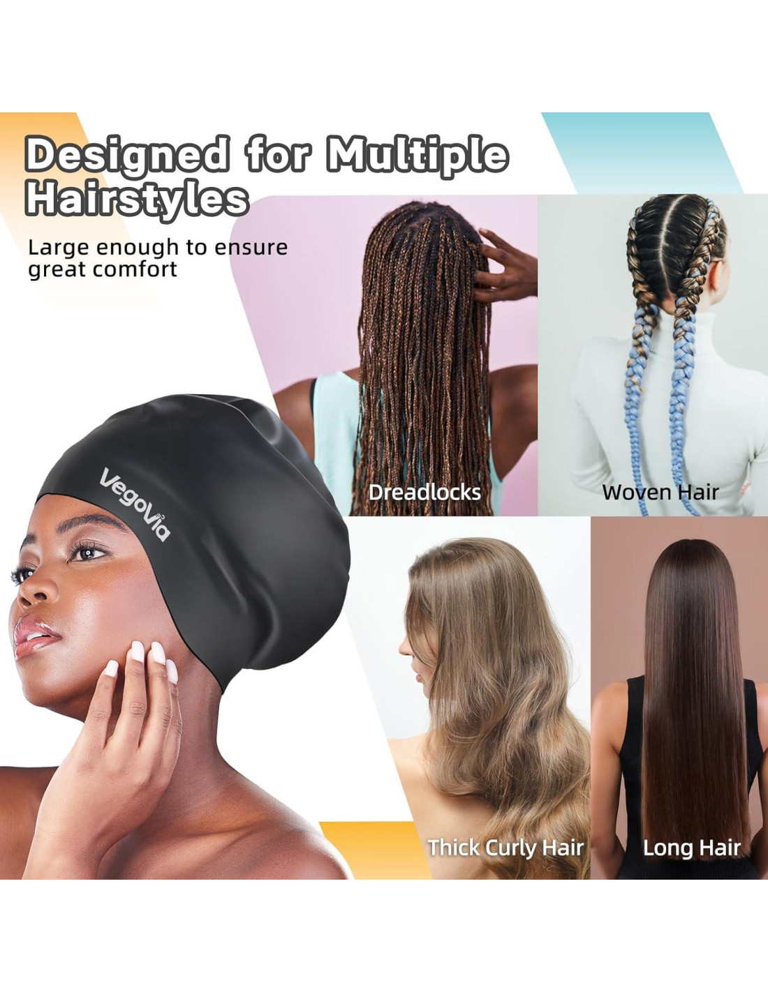 - Capacidad Extra Grande: El gorro de natación extra grande de VegoVia para mujeres está especialmente diseñado para cabello rizado y largo, locs, trenzas, dreadlocks, crochet mambo, extensiones, tejido y cabello afro. Su excepcional elasticidad y diseño extra grande proporcionan suficiente espacio para acomodar cómodamente más cabello. Di adiós a los dolores de cabeza y enredos mientras nadas, solo una experiencia de natación suave y agradable