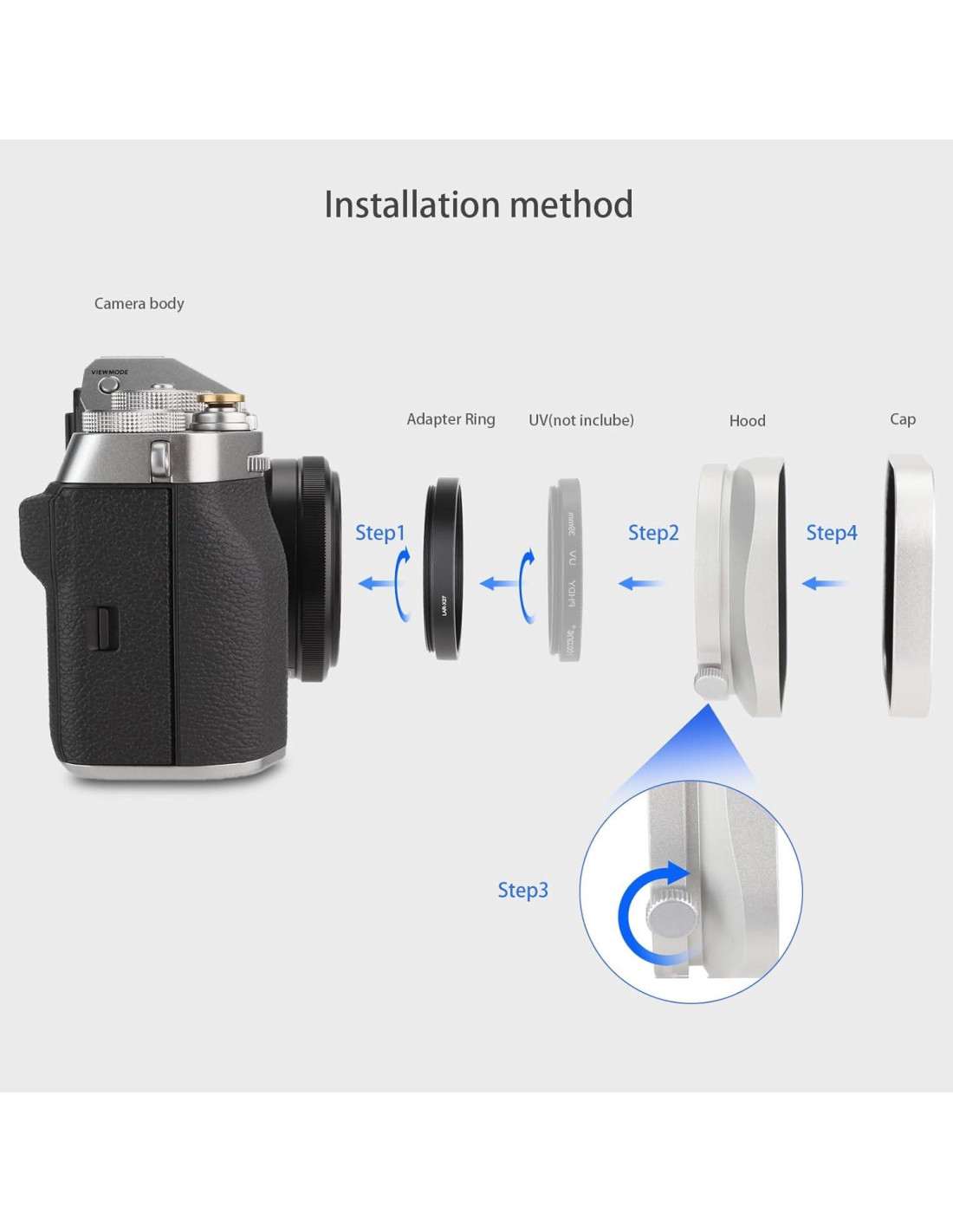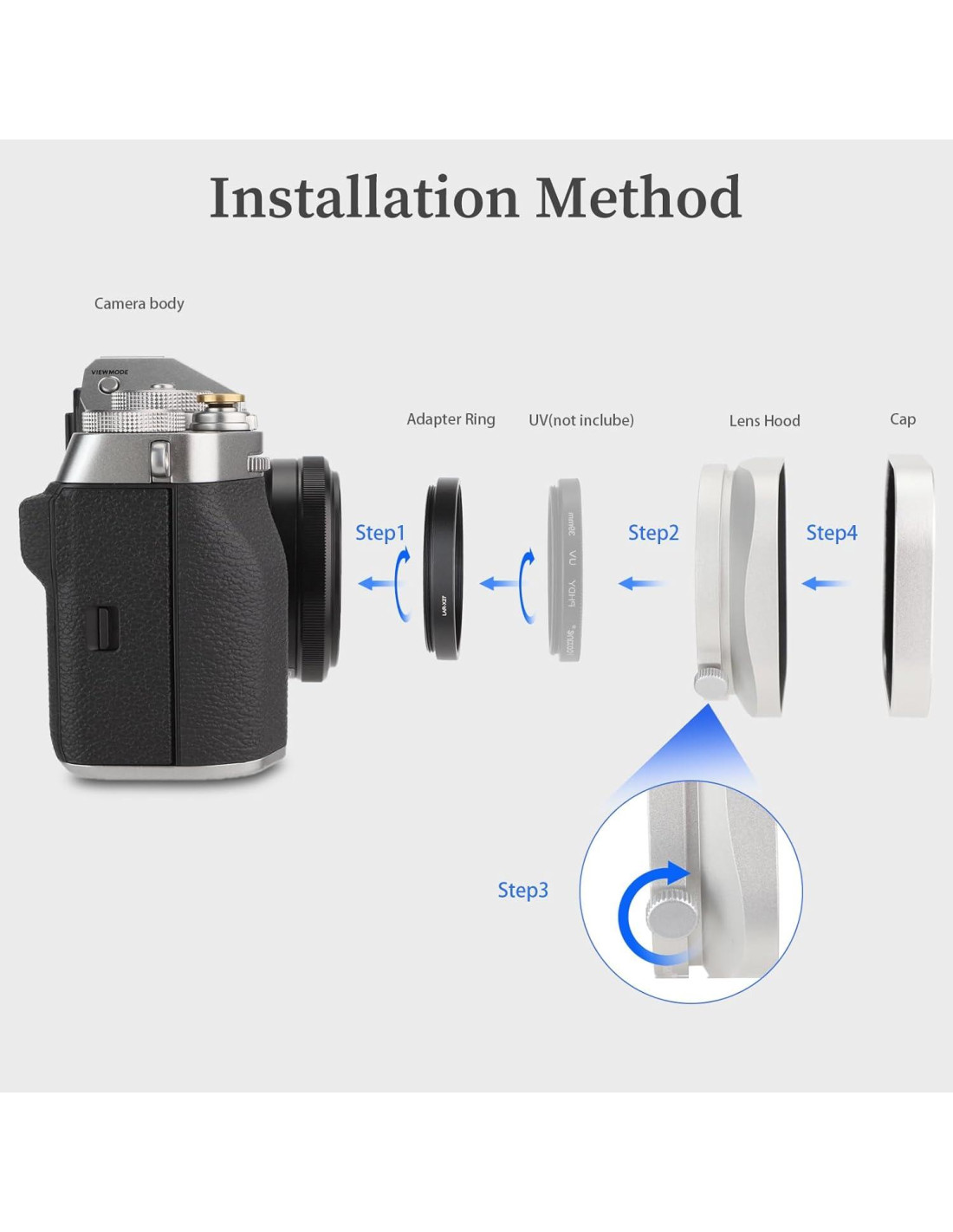 Gorro de lente cuadrado de metal Haoge diseñado especialmente para Fujifilm XF27mmF2.8 R WR. El gorro de lente protege el lente de la luz no deseada, previene o limita el destello del lente, mejorando tu contraste y calidad de imagen. Proporciona protección adicional a la cámara y al lente de rasguños accidentales. Características: Diseñado para Fujifilm Fuji XF27mmF2.8 R WR. Ayuda a bloquear la luz no deseada y los reflejos. Proporciona mayor protección al lente. Construcción de aluminio anodizado duradero. Acabado mate antirreflejo que previene reflejos. Gorro de lente de metal hecho de aluminio anodizado. La tapa de lente original de Fujifilm se puede montar en el lente. No afecta el uso del filtro UV de 39mm. Compatible con: Fujifilm XF27mmF2.8 R WR (Nota: no se puede usar con otros lentes) Instalación: Paso 1: Instalar el anillo adaptador en el lente. Paso 4: Atornillar el gorro de lente al anillo adaptador. Paquete incluido: 1 x Gorro de lente cuadrado de metal Haoge 1 x Tapa de metal Haoge 1 x Anillo adaptador LAR-X28