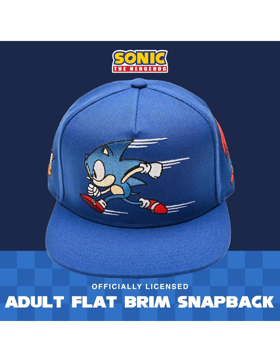 - GORRA DE BEISBOL SONIC THE HEDGEHOG: Gorra ajustable de visera plana azul real para adultos con una imagen de Sonic the Hedgehog corriendo en la parte frontal de la gorra, y sus amigos Tails y Knuckles bordados en los lados