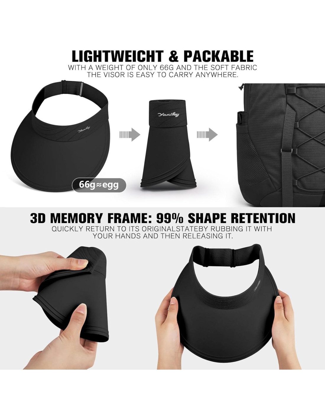 - Memoria de espuma 3D y tela de toque fresco. Fabricada con espuma de memoria 3D sin costuras y tela de toque fresco, la visera de sol YANIKY ofrece un ajuste premium sin presión. La tela está impregnada con tecnología de enfriamiento, manteniéndote fresca mientras bloquea el 99% de los rayos UV con su protección triple capa UPF 50+.