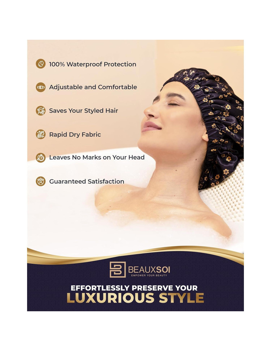 ¿Estás frustrada con los gorros de ducha que dejan pasar la humedad, huelen mal o te provocan dolor de cabeza? ¡Di adiós a los gorros de ducha inferiores y da la bienvenida al Gorro de Ducha de Lujo Beauxsoi! Aquí está el porqué nuestro producto establece el nuevo estándar en excelencia de gorros de ducha: RESISTENCIA AL AGUA AVANZADA: Fabricado con poliéster impermeable de primera calidad y con un lujoso forro de satén, nuestro gorro de ducha ofrece una durabilidad y protección inigualables. Tu cabello se mantiene perfectamente seco y estilizado durante las duchas. AJUSTE CÓMODO AJUSTABLE: Con un diseño ajustable y una banda elástica antideslizante, nuestro gorro de ducha reutilizable se adapta de manera segura a todos los tamaños de cabeza. Perfecto para todos y adecuado para todo tipo de cabello, incluyendo mujeres, hombres y niños. FORRO DE SATÉN LUXUOSO: Mima tu cabello con nuestro gorro de ducha forrado de satén, que no solo mantiene tu cabello seco, sino que también reduce la rotura y realza su brillo natural. Este bonete de cabello asegura que te veas y sientas lujosa todos los días. EMBALAJE DE LUJO: Diseñado por la renombrada diseñadora de BEAUXSOI, Olivera Popov, nuestros gorros de ducha para mujeres vienen en diseños exquisitos y un empaque lujoso, lo que lo convierte en un regalo perfecto para cualquiera que valore tanto el estilo como la funcionalidad. COMPRA SIN RIESGO: Respaldamos la calidad de nuestro producto con una garantía de devolución de dinero de 30 días. Compra con confianza sabiendo que tu satisfacción está garantizada con nuestro gorro de ducha a prueba de agua. Con Beauxsoi, no solo obtienes un gorro de ducha; obtienes un producto revolucionario que redefine la experiencia del gorro de ducha. ¡Di adiós a los gorros de ducha endebles e ineficaces y únete a la revolución Beauxsoi hoy! ¡AGREGA AL CARRITO ahora y transforma tu rutina de ducha!