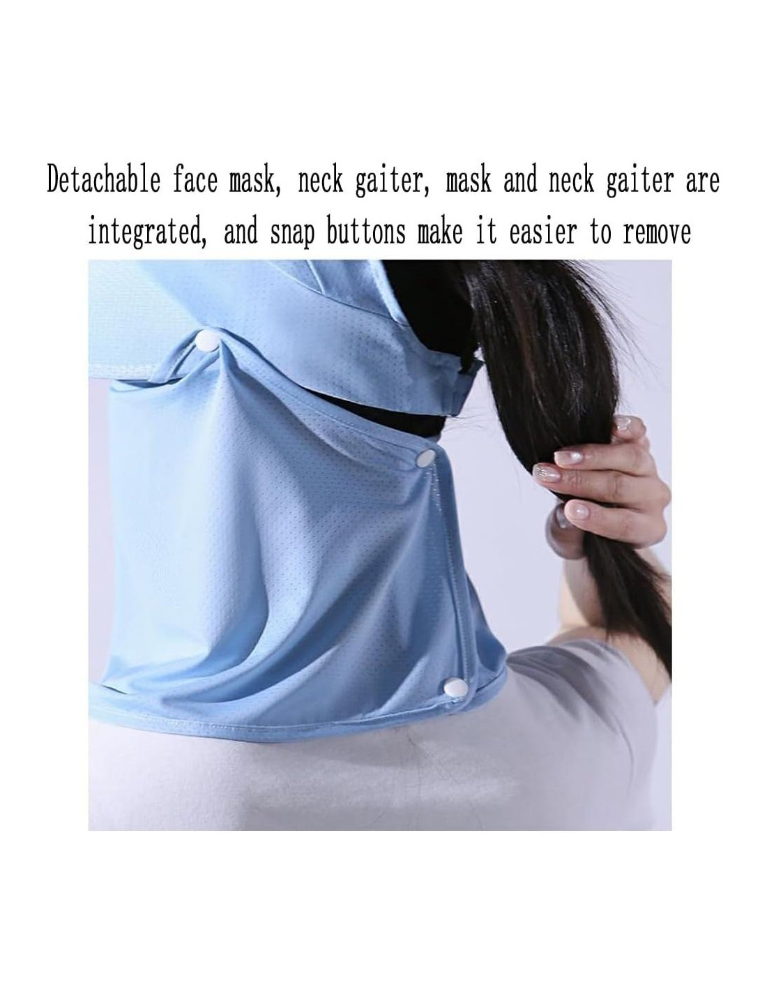 - 4. La máscara removible le permite personalizar su cobertura; máscara de cuello integrada y gaiter de cuello, conexión a presión para un desmontaje más fácil. El ala ampliada de 5.9in (15 cm) cubre un área más grande, cubriendo ambos lados de la cara y mejillas, y proporciona protección solar para muchas partes.