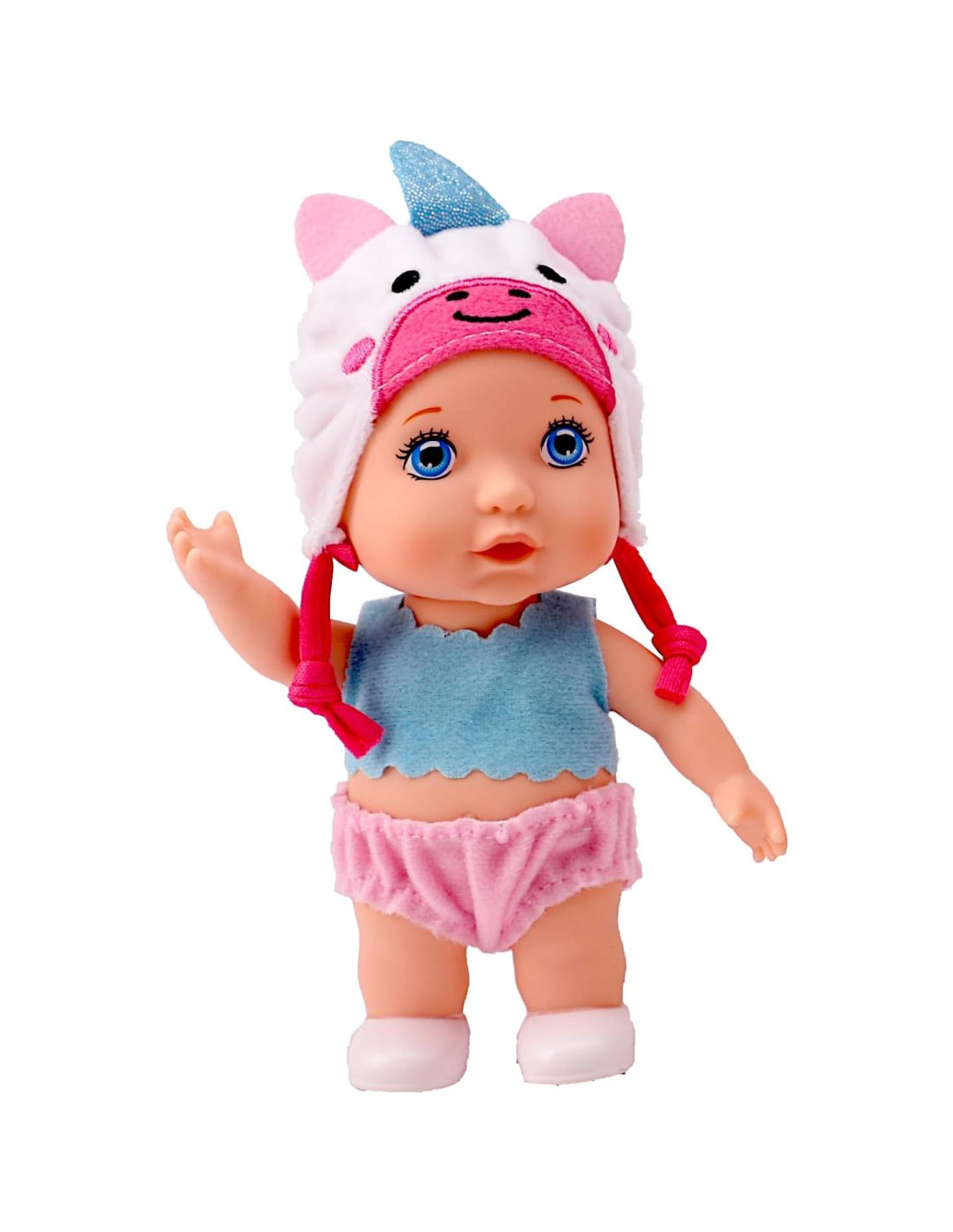- Muñeca de 15 cm con gorro de diseño de unicornio; la muñeca usa un chaleco suave y pantalones cortos, la ropa y el gorro son lavables