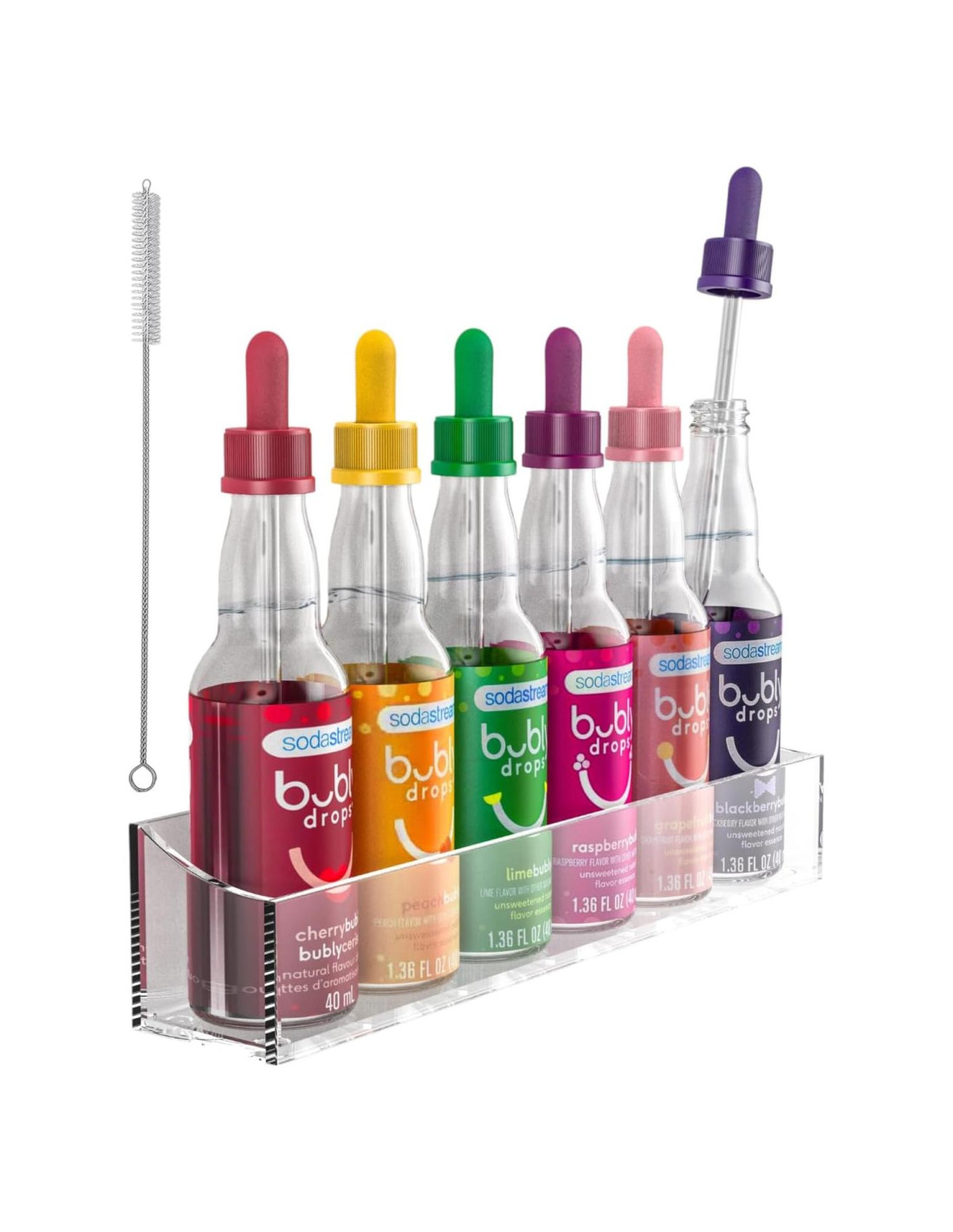 - Eleva tu experiencia con agua con gas con un juego de seis goteros de vidrio de precisión más un elegante estante acrílico para organizar tus gotas.