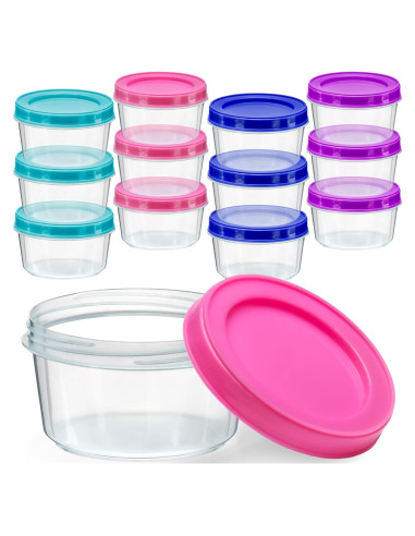 - Conjunto de 12 Tarros de Almacenamiento de Plástico Transparente a Prueba de Rotura con Boca Ancha para Avena Nocturna con Tapas de Rosca de Fácil Agarre, Grado Alimenticio - LIBRE DE BPA - Canisters de Almacenamiento de Plástico, Colores Variados.