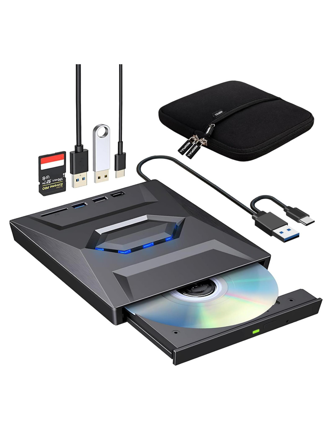 A medida que las laptops modernas continúan volviéndose más delgadas y ligeras, muchas ya no incluyen una unidad de CD/DVD incorporada y a menudo vienen con un número limitado de puertos USB. Ahí es donde entra esta unidad externa de CD/DVD multifuncional, ofreciendo una solución completa para cualquiera que aún valore el acceso a medios físicos y necesite más opciones de conectividad.