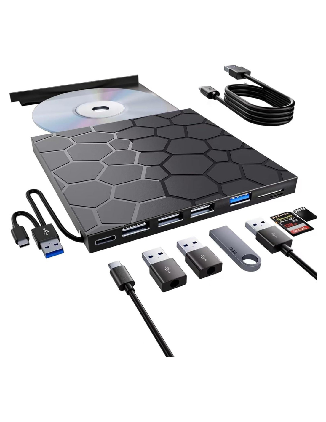 - [8 EN 1 Unidad óptica] Nuestra unidad externa no solo puede grabar y leer CD DVD, sino que también puede usarse como un hub USB externo para portátil, incluyendo 1 puerto USB 3.0, 3 puertos USB 2.0, lector de tarjetas SD o TF y 1 puerto USB-C. Con esta unidad de DVD externa USB, puedes copiar música, videos, fotos y archivos a CDs o DVDs en blanco, convertir y extraer música, video y fotos de CDs/DVDs a tu computadora, instalar juegos, software y sistemas desde discos, y almacenar archivos o datos en CDs/DVDs.