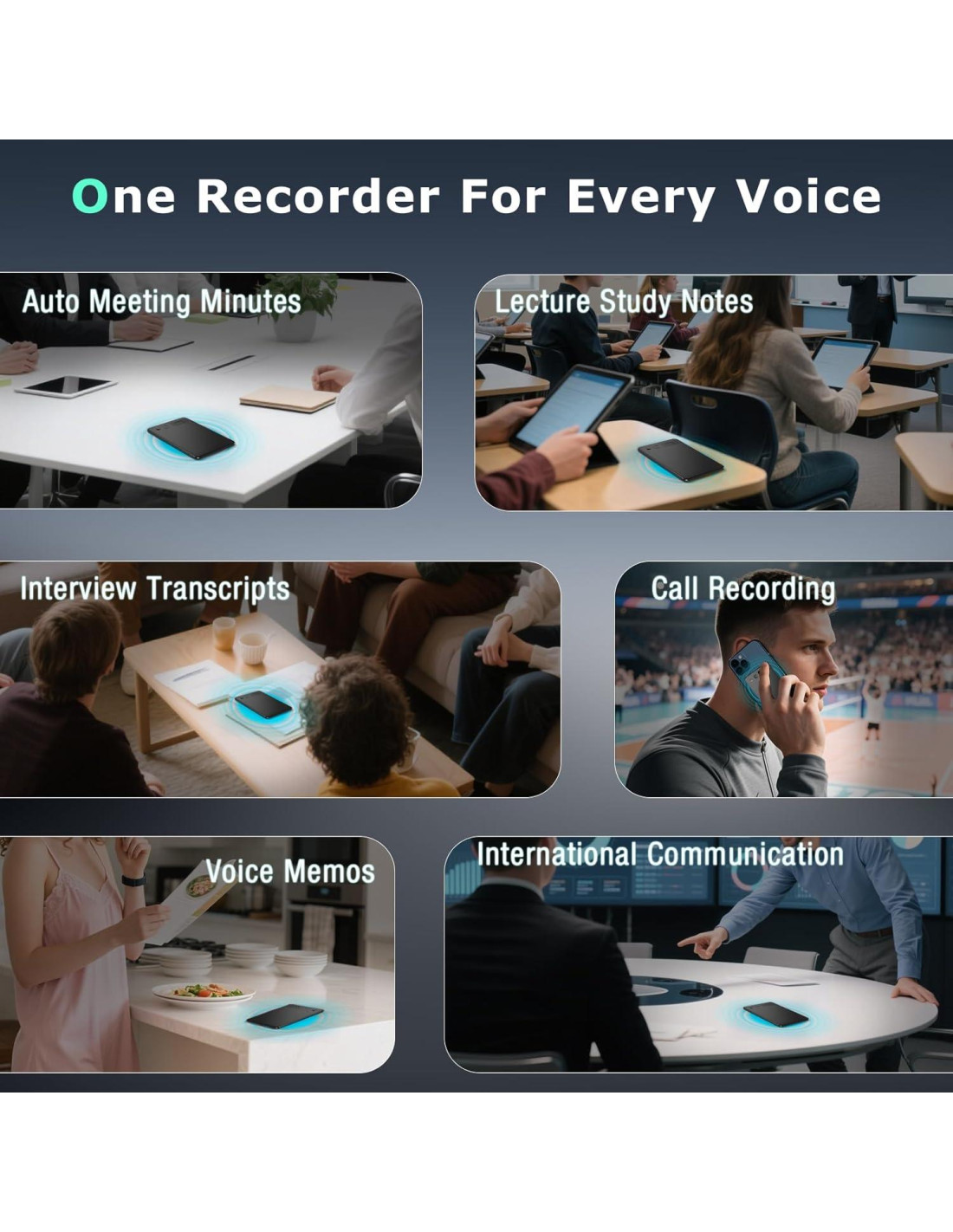 - [Grabación con Reducción de Ruido en Doble Modo] Esta grabadora de audio cuenta con un motor de grabación dual y reducción de ruido triple inteligente, utilizando sensores de conducción aérea para capturar sonidos de alta calidad en entornos de conferencias y presentaciones, mientras que el sensor de conducción por vibración (VCS) asegura grabaciones de llamadas claras al capturar sonidos internos del teléfono. Las configuraciones de privacidad pueden ocultar el estado de 'grabación en progreso' de tu dispositivo de comunicación a la otra parte. La función de distinción de altavoces separa automáticamente las pistas de audio de ambas partes en la conversación.
