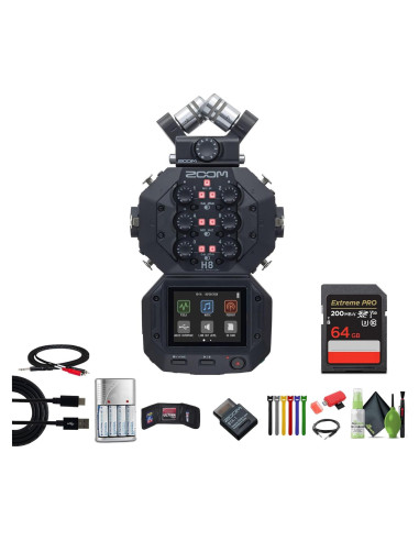 - El paquete incluye: Grabadora de Audio Portátil Zoom H8 de 12 Pistas + Adaptador Bluetooth Zoom BTA-1 para ARQ AR-48, L-20, R20, H3-VR y F6 + Auriculares Estéreo Profesionales Sony MDR-7506 + Cartera para Tarjeta de Memoria + Micrófono de Condensador Shotgun de Línea/Gradiente Audio-Technica AT875R + Cable de Inserción TRS de 1/4 de pulgada a Doble RCA + 4xAA CON CARGADOR + Tarjeta de Memoria SDXC Extreme PRO de 64GB + Paquete de 2 Cable XLR de Hembra a Macho + Kit de limpieza + Correas + TRÍPODE FLEXIBLE de 12 pulgadas + Lector de Tarjetas USB Diginerds, SD/microSD + Xpix Balance