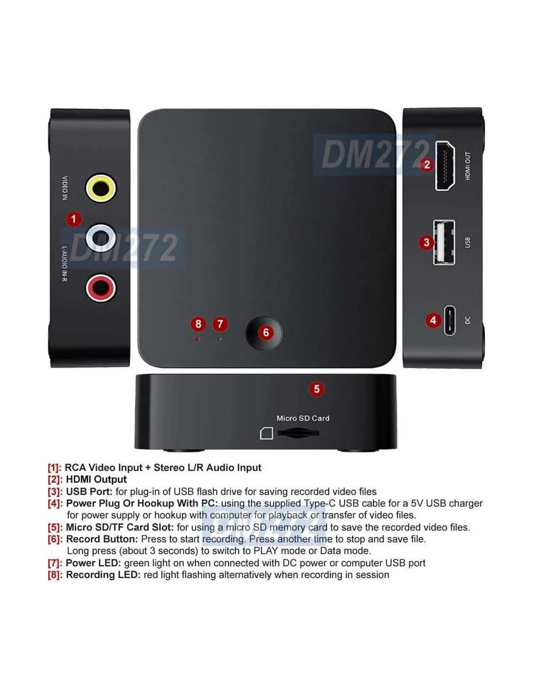 Este grabador de video digital independiente permite a los usuarios grabar audio de video compuesto RCA analógico en formato de archivo digital MPEG4 y guardarlo en una unidad USB o tarjeta micro SD/TF de elección del usuario. Es un grabador de video digital independiente con todas las funciones que no necesita conexión a computadora. Los usuarios pueden convertir sus viejas cintas de video o cintas de videocámara a formato digital con solo presionar un botón. Velocidad de grabación suave de 9.3MB/min (0.56GB/hora). Soporta tarjeta de memoria y unidad USB de hasta 64GB. Grabación de A/V compuesto RCA analógico Este grabador de video digital puede grabar todas las salidas de video analógico de fuentes como reproductores de DVD/VCR, cámaras de video, DVR de vigilancia, etc., y guardar la grabación en una tarjeta micro SD o unidad USB de elección del usuario. [Nota]: El tamaño máximo de la tarjeta micro SD o tarjeta TF soportada es de 64GB y debe estar en formato FAT32 y NTFS. Formato exFAT no soportado. Entrada RCA A/V con salida HD Este grabador de video cuenta con una salida HD para que los usuarios puedan ver lo que se está grabando en la pantalla de TV o monitor HDV, o grabar lo que están viendo en tiempo real sin retrasos. Digitalizar colección de video analógico a DVD Este grabador de audio de video analógico proporciona a los usuarios una solución fácil para digitalizar cintas VHS y otros contenidos de video analógico a tipo digital. Grabador de juegos en vivo Los usuarios pueden jugar y grabar juegos en pantalla completa al mismo tiempo, preservando un juego fluido. Consolas de juegos con salida A/V compuesto RCA como PS2, PS3, Xbox one, Xbox 360 y Wii pueden ser grabadas a través de este dispositivo en la tarjeta de memoria. Conexión USB con PC para reproducción o transferencia de datos Una vez completada la grabación, los usuarios pueden reproducir el archivo grabado en un reproductor de DVD o computadora, o transferir archivos de video grabados a la computadora para su posterior edición y otros trabajos de postproducción.