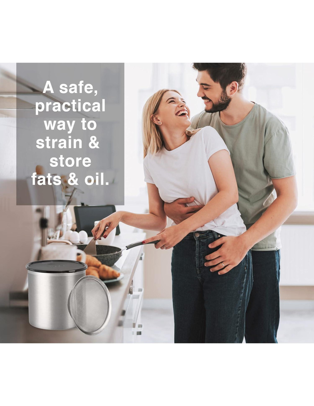 CONTENEDOR DE ACEITE USADO ELEGANTE, RESISTENTE, DE GRAN CAPACIDAD Y VERSÁTIL, PERFECTO PARA COCINA, CAMPING Y VEHÍCULO RECREATIVO - Almacena tus grasas de tocino, grasa y aceite de cocina usando este contenedor de grasa jumbo. Hecho de acero inoxidable duradero, este robusto contenedor de aceite de uso pesado cuenta con un inserto de colador para mantener tu grasa limpia y fresca. Separa fácilmente las partículas de comida cocinada, como los trozos de tocino, de la grasa. Incluye una tapa para el contenedor que te permite almacenar la grasa de freír o cocinar colada para su eliminación segura o reutilización una vez que se haya enfriado. Evita los olores de aceite de cocina en la casa o en el vehículo recreativo. Se ve genial en la encimera y se ajusta de manera segura en el refrigerador. Perfecto contenedor de grasa de tocino. Soporta estilos de vida keto, cetogénico y paleo. La capacidad jumbo de 1 Galón (3.78 Lt) / 4 Cuartos (3.78 Lt) / 3.75 Litros es lo suficientemente ancha y profunda para verter grasa directamente de la sartén. También es adecuado para uso en vehículos recreativos, ya que no es demasiado grande y la tapa mantiene los contenidos seguros. Cuidado y limpieza: Limpiar con un paño húmedo. Incluye una tapa para el contenedor que te permite almacenar la grasa de cocina colada para su eliminación segura una vez que se haya enfriado.