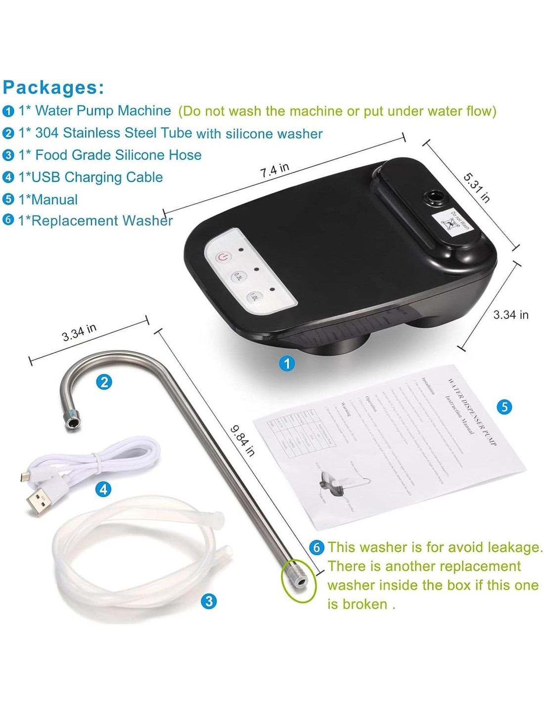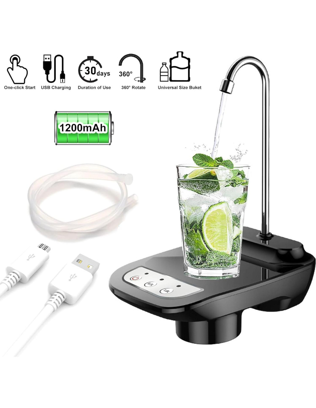 - Batería recargable incorporada de 1200mAh: se puede usar para alrededor de 5-7 botellas de agua de 5 galones después de una carga completa. Cargue la bomba primero si no funciona cuando reciba la nueva máquina.